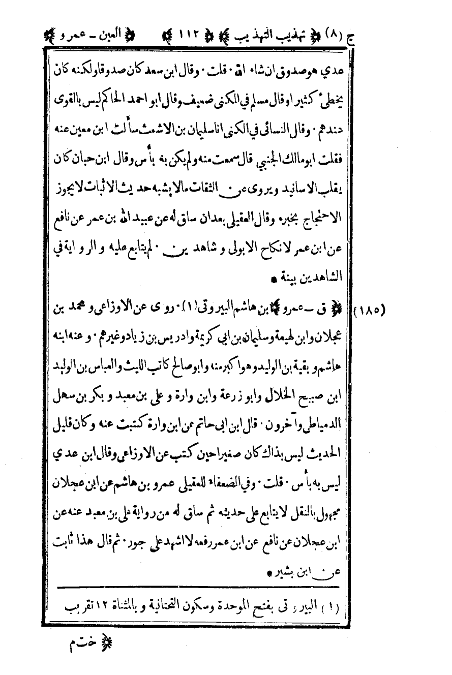 186 – "ق – عمرو" بن هاشم البيروتي1 روى عن الأوزاعي ومحمد بن عجلان وابن لهيعة وسليمان بن أبي كريمة وإدريس بن زياد وغيرهم وعنه ابنه هاشم وبقية بن الوليد وهو أكبر منه وأبو صالح كاتب الليث والعباس بن الوليد بن صبيح الخلال وأبو زوعة وابن وارة وعلي بن معبد وبكر بن سهل الدمياطي وآخرون قال بن أبي حاتم عن بن وراة كتبت عنه وكان قليل الحديث ليس بذاك كان صغيرا حين كتب عن الأوزاعي وقال بن عدي ليس به بأس قلت وفي الضعفاء للعقيلي عمرو بن هاشم عن بن عجلان مجهول بالنقل لا يتابع علي حديثه ثم ساق له من رواية علي بن معبد عنه عن بن عجلان عن نافع عن بن عمر رفعه لا أشهد على جور ثم قال هذا ثابت عن ابن بشير