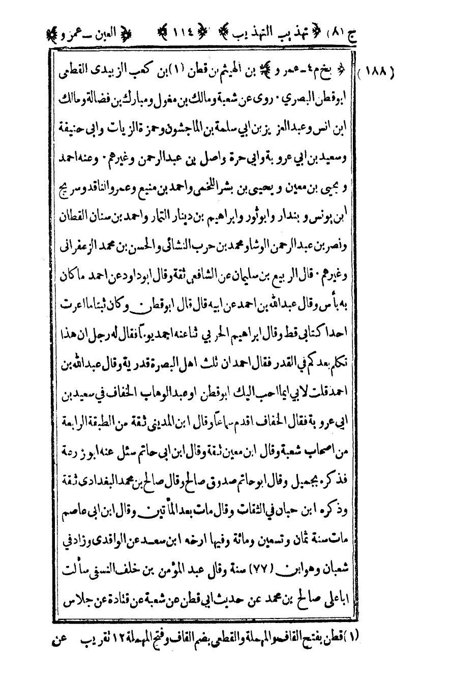 189 – "بخ م 4 – عمرو" بن الهيثم بن قطن1 بن كعب الزبيدي القطعي أبو قطن البصري روى عن شعبة ومالك بن مغول ومبارك بن فضالة ومالك بن أنس وعبد العزيز بن أبي سلمة بن الماجشون وحمزة الزيات وأبي حنيفة وسعيد بن أبي عروبة وأبي حرة واصل بن عبد الرحمن وغيرهم وعنه أحمد ويحيى بن معين ويحيى بن بشر اللخمي وأحمد بن منيع وعمرو الناقد وسريج بن يونس وبندار وأبو ثور وإبراهيم بن دينار التمار وأحمد بن سنان القطان ونصر بن عبد الرحمن الوشاء ومحمد بن حرب النشائي والحسن بن محمد الزعفراني وغيرهم قال الربيع بن سليمان عن الشافعي ثقة وقال أبو داود ثقة عن أحمد ما كان به بأس وقال عبد الله بن أحمد عن أبيه قال قال أبو قطن وكان ثبتا ما أعرت أحدا كتابي قط وقال إبراهيم الحربي ثنا عنه أحمد يوما فقال له رجل إن هذا تكلم بعدكم في القدر فقال أحمد إن ثلث أهل البصرة قدرية وقال عبد الله بن أحمد قلت لأبي أيما أحب إليك أبو قطن أو عبد الوهاب الخفاف في سعيد بن أبي عروبة فقال الخفاف أقدم سماعا وقال بن المديني ثقة من الطبقة الرابعة من أصحاب شعبة وقال بن معين ثقة وقال بن أبي حاتم سئل عنه أبو زرعة فذكره بجميل وقال أبو حاتم صدوق صالح وقال صالح بن محمد البغدادي ثقة وذكره بن حبان في الثقات وقال مات بعد المائتين وقال بن أبي عاصم مات سنة ثمان وتسعين ومائة وفيها أرخه بن سعد عن الواقدي وزاد في شعبان وهو بن 77 سنة وقال عبد المؤمن بن خلف النسفي سألت أبا علي صالح بن محمد عن حديث أبي قطن عن شعبة عن قتادة عن جلاس
