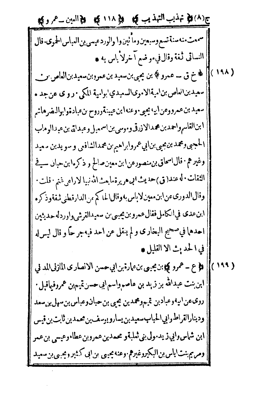 199- "خ ق – عمرو" بن يحيى بن سعيد بن عمرو بن سعيد بن العاص بن سعيد بن العاص بن أمية الأموي السعيدي أبو أمية المكي روى عن جده سعيد بن عمرو وعن أبيه يحيى وعنه بن عيينة وروح بن عبادة وأبو النضر هاشم بن القاسم وأحمد بن محمد الأزرقي وموسى بن إسماعيل وعبد الله بن عبد الوهاب الحجبي ومحمد بن يحيى بن أبي عمر وإبراهيم بن محمد الشافعي وسويد بن سعيد وغيرهم قال إسحاق بن منصور عن بن معين صالح وذكره بن حبان في الثقات له عند ق حديث أبي هريرة "ما بعث الله نبيا إلا راعي غنم" قلت وقال الدوري عن بن معين لا بأس به وقال الحاكم عن الدارقطني ثقة وذكره بن عدي في الكامل فقال عمرو بن يحيى بن سعيد القرشي وأورد له حديثين أحدهما في صحيح البخاري ولم ينقل عن أحد فيه جرحا وقال ليس له في الحديث الا القليل