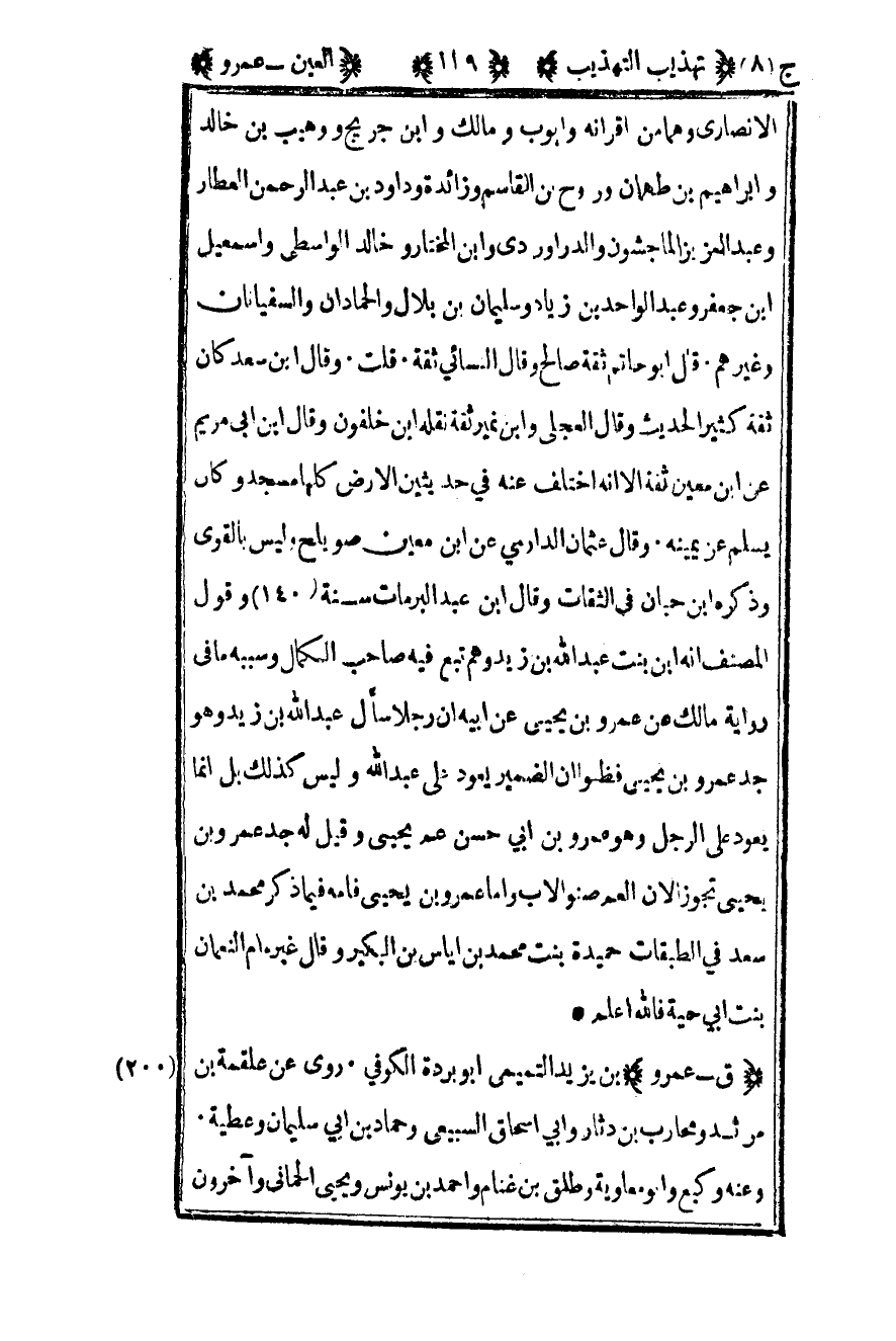 201 – "ق –عمرو" بن يزيد التميمي أبو بردة الكوفي روى عن علقمة بن مرثد ومحارب بن دثار وأبي إسحاق السبيعي وحماد بن أبي سليمان وعطية وعنه وكيع وأبو معاوية وطلق بن غنام وأحمد بن يونس ويحيى الحماني وآخرون