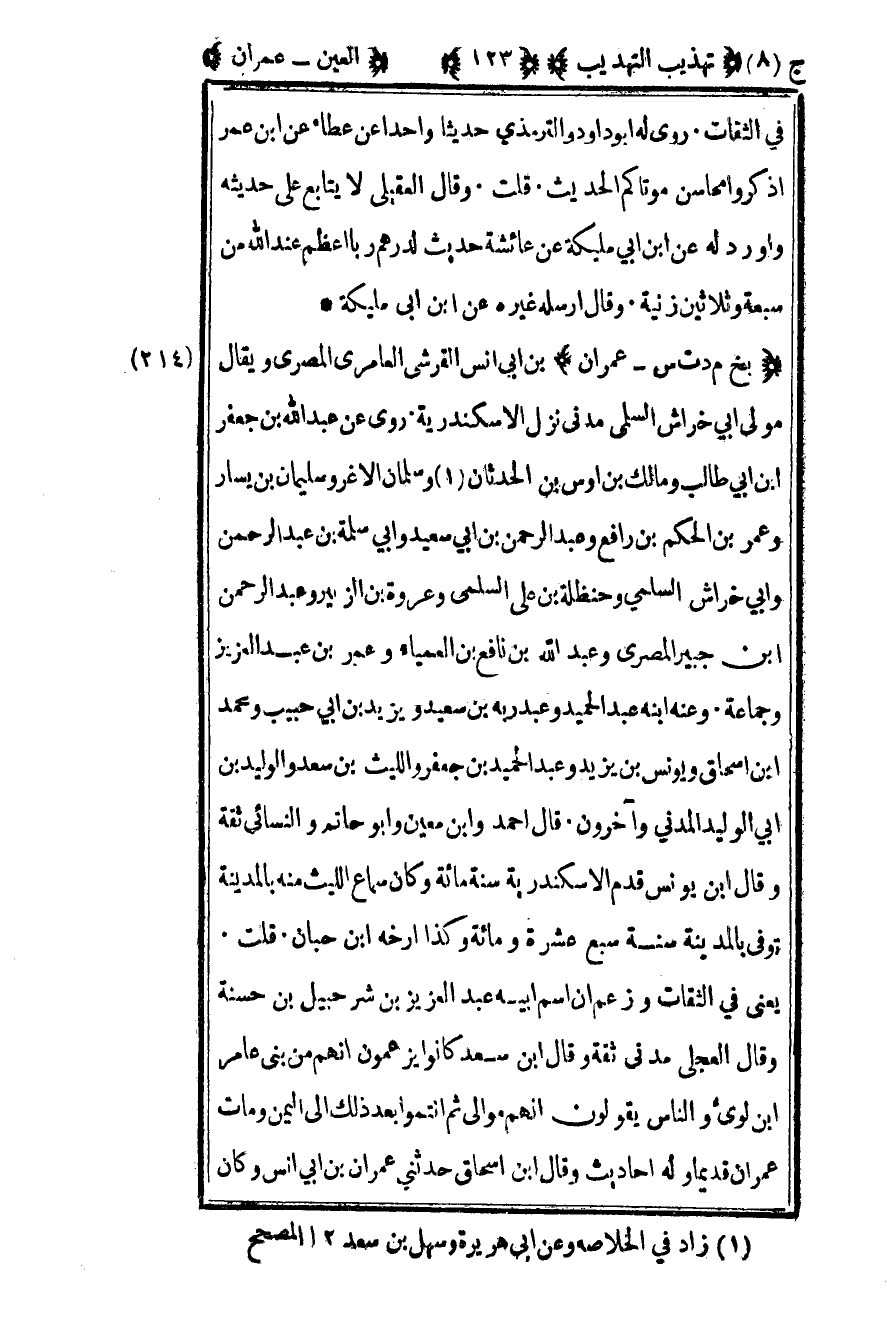 215 – "بخ م د ت س – عمران" بن أبي أنس القرشي العامري المصري ويقال مولى أبي خراش السلمي مدني نزيل الإسكندرية روى عن عبد الله بن جعفر بن أبي طالب ومالك بن أوس بن الحدثان1 وسلمان الأغر وسليمان بن يسار وعمر بن الحكم بن رافع وعبد الرحمن بن أبي سعيد وأبي سلمة بن عبد الرحمن وأبي خراش السلمي وحنظلة بن علي السلمي وعروة بن الزبير وعبد الرحمن بن جبير المصري وعبد الله بن نافع بن العمياء وعمر بن عبد العزيز وجماعة وعنه ابنه عبد الحميد وعبد ربه بن سعيد ويزيد بن أبي حبيب ومحمد بن إسحاق ويونس بن يزيد وعبد الحميد بن جعفر والليث بن سعد والوليد بن أبي الوليد المدني وآخرون قال أحمد وابن معين وأبو حاتم والنسائي ثقة وقال بن يونس قدم الإسكندرية سنة مائة وكان سماع الليث منه بالمدينة توفي بالمدينة سنة سبع عشرة ومائة وكذا أرخه بن حبان قلت يعني في الثقات وزعم أن اسم أبيه عبد العزيز بن شرحبيل بن حسنة وقال العجلي مدني ثقة وقال بن سعد كانوا يزعمون إنهم من بني عامر بن لؤي والناس يقولون إنهم موالي ثم انتموا بعد ذلك إلى اليمن ومات عمران قديما وله أحاديث وقال بن إسحاق حدثني عمران بن أبي أنس وكان