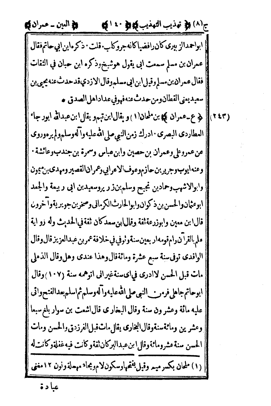 244 – "ع – عمران" بن ملحان1 ويقال بن تيم ويقال بن عبد الله أبو رجاء العطاردي البصري أدرك زمن النبي صلى الله عليه وسلم ولم يره وروى عن عمر وعلي وعمران بن حصين وابن عباس وسمرة بن جندب وعائشة وعنه أيوب وجرير بن حازم وعوف الأعرابي وعمران القصير ومهدي بن ميمون وأبو الأشهب وحماد بن نجيح وسلم بن زرير وسعيد بن أبي ربيعة والجعد أبو عثمان والحسن بن ذكوان وأبو الحارث الكرماني وصخر بن جويرية وآخرون قال بن معين وأبو زرعة ثقة وقال بن سعد كان ثقة في الحديث وله رواية علم بالقرآن وأم قومه أربعين سنة وتوفي في خلافة عمر بن عبد العزيز قال وقال الواقدي توفي سنة سبع عشرة ومائة قال وهذا عندي وهل وقال الذهلي مات قبل الحسن لا أدري في أي سنة غير أني أتوهمه سنة 107 وقال أبو حاتم جاهلي فر من النبي صلى الله عليه وسلم ثم أسلم بعد الفتح وأتى عليه مائة وعشرون سنة وقال البخاري قال أشعث بن سوار بلغ سبعا وعشرين ومائة سنة وقال البخاري يقال مات قبل الفرزدق والحسن ومات الحسن سنة عشر ومائة وقال بن عبد البر كان ثقة وكانت فيه غفلة وكانت له