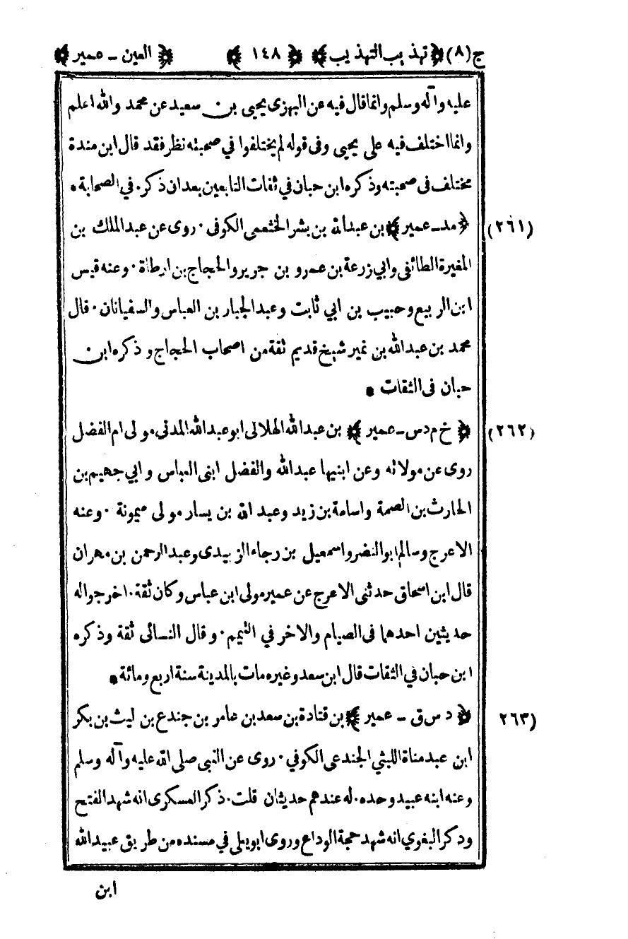 262 – "مد – عمير" بن عبد الله بن بشر الخثعمي الكوفي روى عن عبد الملك بن المغيرة الطائفي وأبي زرعة بن عمرو بن جرير والحجاج بن أرطاة وعنه قيس بن الربيع وحبيب بن أبي ثابت وعبد الجبار بن العباس والسفيانات قال محمد بن عبد الله بن نمير شيخ قديم ثقة من أصحاب الحجاج وذكره بن حبان في الثقات