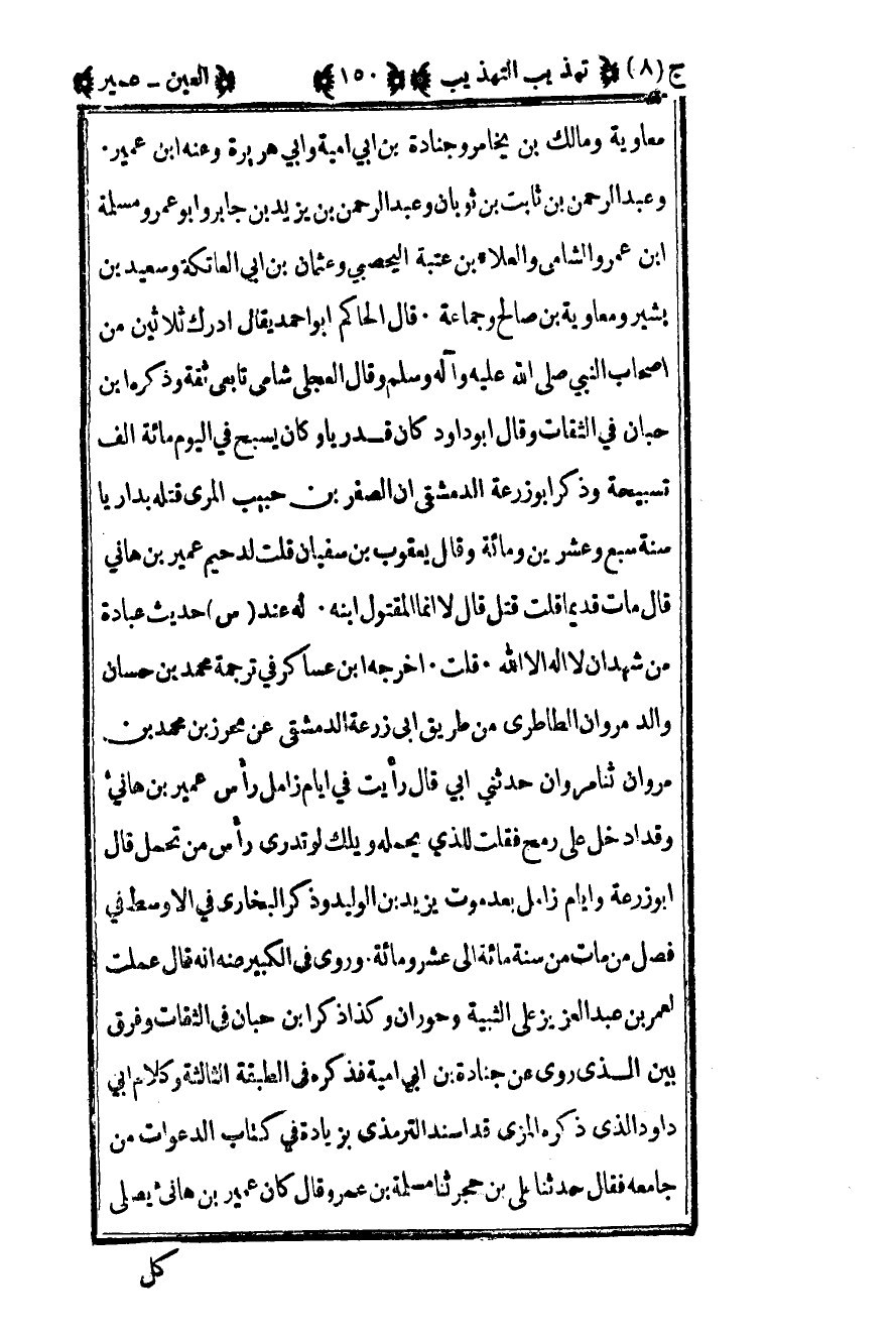 معاوية ومالك بن يخامر وجنادة بن أبي أمية وأبي هريرة وعنه بن عمير وعبد الرحمن ثابت بن ثوبان وعبد الرحمن بن يزيد بن جابر وأبو عمرو ومسلمة بن عمرو الشامي والعلاء بن عتبة اليحصبي وعثمان بن أبي العاتكة وسعيد بن بشير ومعاوية بن صالح وجماعة قال الحاكم أبو أحمد يقال أدرك ثلاثين من أصحاب النبي صلى الله عليه وسلم وقال العجلي شامي تابعي ثقة وذكره بن حبان في الثقات وقال أبو داود كان قدريا وكان يسبح في اليوم مائة ألف تسبيحة وذكر أبو زرعة الدمشقي أن الصفر بن حبيب المري قتله بداريا سنة سبع وعشرين ومائة وقال يعقوب بن سفيان قلت لدحيم عمير بن هاني قال مات قديما قلت قتل قال لا إنما المقتول ابنه له عند س حديث عبادة من "شهد أن لا إله إلا الله" قلت أخرجه بن عساكر في ترجمة محمد بن حسان والد مروان الطاطري من طريق أبي زرعة الدمشقي عن محرز بن محمد بن مروان ثنا مروان حدثني أبي قال رأيت في أيام زامل رأس عمير بن هانئ وقد أدخل على رمح فقلت للذي يحمله ويلك لو تدري رأس من تحمل قال أبو زرعة وأيام زامل بعد موت يزيد بن الوليد وذكر البخاري في الأوسط في فصل من مات من سنة مائة إلى عشر ومائة وروى في الكبير عنه أنه قال عملت لعمر بن عبد العزيز على الثبية وحوران وكذا ذكر بن حبان في الثقات وفرق بين الذي روى عن جنادة بن أبي أمية فذكره في الطبقة الثالثة وكلام أبي داود الذي ذكره المزي قد أسند الترمذي بزيادة في كتاب الدعوات من جامعه فقال حدثنا علي بن حجر ثنا مسلمة بن عمر وقال كان عمير بن هانئ يصلي