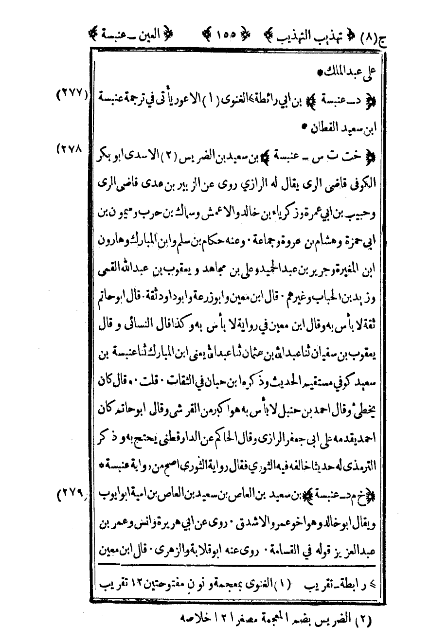279- "خت ت س – عنبسة" بن سعيد بن الضريس3 الأسدي أبو بكر الكوفي قاضي الري يقال له الرازي روى عن الزبير بن عدي قاضي الري وحبيب بن أبي عمرة وزكرياء بن خالد والأعمش وسماك بن حرب وميمون بن أبي حمزة وهشام بن عروة وجماعة وعنه حكام بن سلم وابن المبارك وهارون بن المغيرة وجرير بن عبد الحميد وعلي بن مجاهد ويعقوب بن عبد الله القمي وزيد بن الحباب وغيرهم قال بن معين وأبو زرعة وأبو داود ثقة قال أبو حاتم ثقة لا بأس به وقال بن معين في رواية لا بأس به وكذا قال النسائي وقال يعقوب بن سفيان ثنا عبد الله بن عثمان ثنا عبد الله يعني بن المبارك ثنا عنبسة بن سعيد كوفي مستقيم الحديث وذكره بن حبان في الثقات قلت وقال كان يخطىء وقال أحمد بن حنبل لا بأس به هو أكبر من القرشي وقال أبو حاتم كان أحمد يقدمه على أبي جعفر الرازي وقال الحاكم عن الدارقطني يحتج به وذكر الترمذي له حديثا خالفه فيه الثوري فقال رواية الثوري أصح من رواية عنبسة