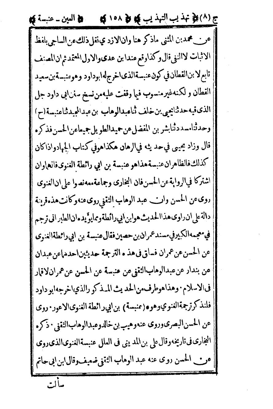 عن محمد بن المثنى ما ذكر هنا وأن الأزدي نقل ذلك عن الساجي بلفظ الإثبات لا النفي قال وكذا وقع عند بن عدي والأول المعتمد ثم أن المصنف تابع لابن القطان في كون عنبسة الذي أخرج له أبو داود وهو عنبسة بن سعيد القطان ولكنه غير منسوب فيما وقفت عليه من نسخ سنن أبي داود جل الذي فيه حدثنا يحيى بن خلف ثنا عبد الوهاب بن عبد المجيد ثنا عنبسة ح وحدثنا مسدد ثنا بشر بن المفضل عن حميد الطويل جميعا عن الحسن فذكره قال وزاد يحيى في حديثه في الرهان هكذا هو في كتاب الجهاد وإذا كان كذلك فالظاهر أن عنبسة هذا هو عنبسة بن أبي رائطة الغنوي فإنهما وإن اشتركا في الرواية عن الحسن فإن البخاري وجماعة معه نصوا على أن الغنوي روى عن الحسن وأن عبد الوهاب الثقفي روى عنه وكانت هذه قرينة دالة على أن راوي هذا الحديث هو بن أبي رائطة ومما يؤيده أن الطبراني ترجم في معجمه الكبير في مسند عمران بن حصين فقال عنبسة بن أبي رائطة الغنوي عن الحسن عن عمران فساق في هذه الترجمة حديثين أحدهما عن عبدان عن بندار عن عبد الوهاب الثقفي عن عنبسة عن الحسن عن عمران لا قمار في الإسلام وهذا هو طرف من الحديث المذكور الذي أخرجه أبو داود فلنذكر ترجمة الغنوي وهو عنبسة بن أبي رائطة الغنوي الأعور روى عن الحسن البصري وروى عنه وهيب بن خالد وعبد الوهاب الثقفي ذكره البخاري في تاريخه وقال علي بن المديني في العلل عنبسة الغنوي الذي روى عن الحسن روى عنه عبد الوهاب الثقفي ضعيف وقال ابن أبي حاتم