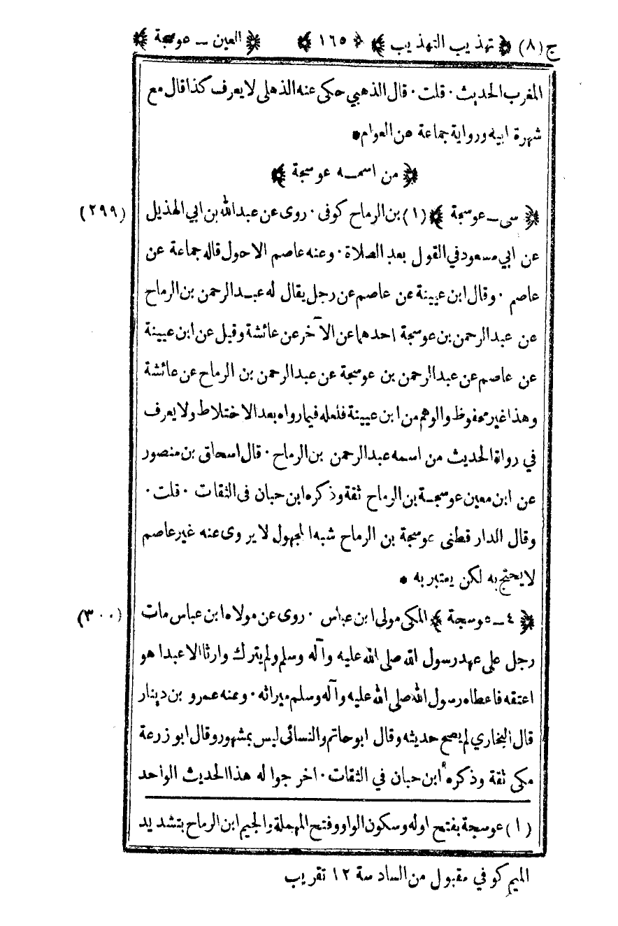 301- 4 – عوسجه" المكي مولى بن عباس روى عن مولاه بن عباس مات رجل على عهد رسول الله صلى الله عليه وسلم ولم يترك وارثا إلا عبدا هو أعتقه فأعطاه رسول الله صلى الله عليه وسلم ميراثه وعنه عمرو بن دينار قال البخاري لم يصح حديثه وقال أبو حاتم والنسائي ليس بمشهور وقال أبو زرعة مكي ثقة وذكره بن حبان في الثقات أخرجوا له هذا الحديث الواحد
