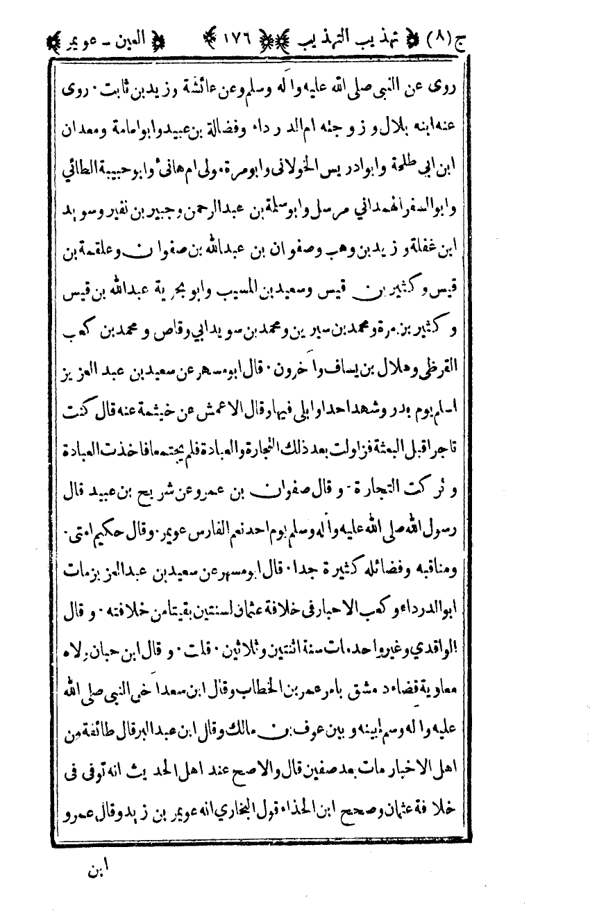 روى عن النبي صلى الله عليه وسلم وعن عائشة وزيد بن ثابت روى عنه ابنه بلال وزوجته أم الدرداء وفضالة بن عبيد وأبو إمامة ومعدان بن أبي طلحة وأبو إدريس الخولاني وأبو مرة مولى أم هانئ وأبو حبيبة الطائي وأبو السفر الهمداني مرسل وأبو سلمة بن عبد الرحمن وجبير بن نفير وسويد بن غفلة وزيد بن وهب وصفوان بن عبد الله بن صفوان وعلقمة بن قيس وكثير بن قيس وسعيد بن المسبب وأبو بحرية عبد الله بن قيس وكثير بن مرة ومحمد بن سيرين ومحمد بن سويد أبي وقاص ومحمد بن كعب القرظي وهلال بن يساف وآخرون قال أبو مسهر عن سعيد بن عبد العزيز أسلم يوم بدر وشهد أحدا وأبلى فيها وقال الأعمش عن خيثمة عنه قال كنت تاجرا قبل البعثة فزاولت بعد ذلك التجارة والعبادة فلم يجتمعا فأخذت العبادة وتركت التجارة وقال صفوان بن عمير وعن شريح بن عبيد قال رسول الله صلى الله عليه وسلم يوم أحد "نعم الفارس عويمر" وقال حكيم أمتي ومناقبه وفضائله كثيرة جدا قال أبو مسهر عن سعيد بن عبد العزيز مات أبو الدرداء وكعب الأحبار في خلافة عثمان لسنتين بقيتا من خلافته وقال الواقدي وغير واحد مات سنة اثنتين وثلاثين قلت وقال بن حبان ولاه معاوية قضاء دمشق بأمر عمر بن الخطاب وقال بن سعد آخى النبي صلى الله عليه وسلم بينه وبين عوف بن مالك وقال بن عبد البر قال طائفة من أهل الأخبار مات بعد صفين قال والأصح عند أهل الحديث أنه توفي في خلافة عثمان وصحح بن الحذاء قول البخاري أنه عويمر بن زيد وقال عمرو بن علي عن بعض ولده مات قبل عثمان بسنة.