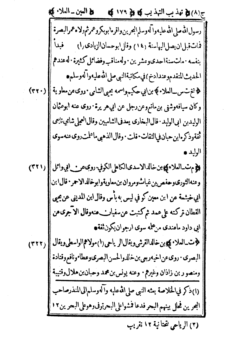 323 – "ت – العلاء" بن خالد القرشي ويقال الرياحي2 مولاهم الواسطي ويقال البصري روى عن أخيه ربعي بن خالد والحسن البصري وعطاء ونافع وقتادة ومنصور بن زاذان وغيرهم وعنه يونس بن محمد وحبان بن هلال وقتيبة