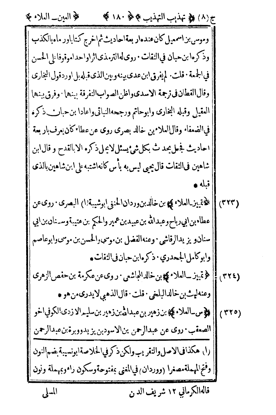 325- "تمييز – العلاء" بن خالد المجاشعي روى عن عكرمة بن حفص الزهري وعنه ليث بن خالد البلخي قلت قال الذهبي لا يدري من هو