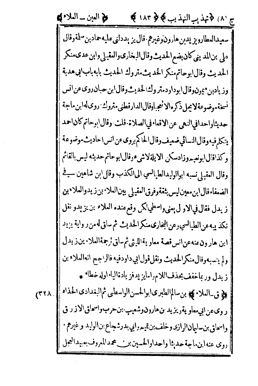 329 – "ق – العلاء" بن سالم الطبري أبو الحسن الواسطي ثم البغدادي الحذاء روى عن أبي معاوية ويزيد بن هارون وشعيب بن حرب وإسحاق الأزرق وإسحاق بن سليمان الرازي وخلف بن تميم وأبي بدر شجاع بن الوليد وغيرهم روى عنه بن ماجة حديثا واحدا والحسين بن محمد المعروف بعبيد العجل