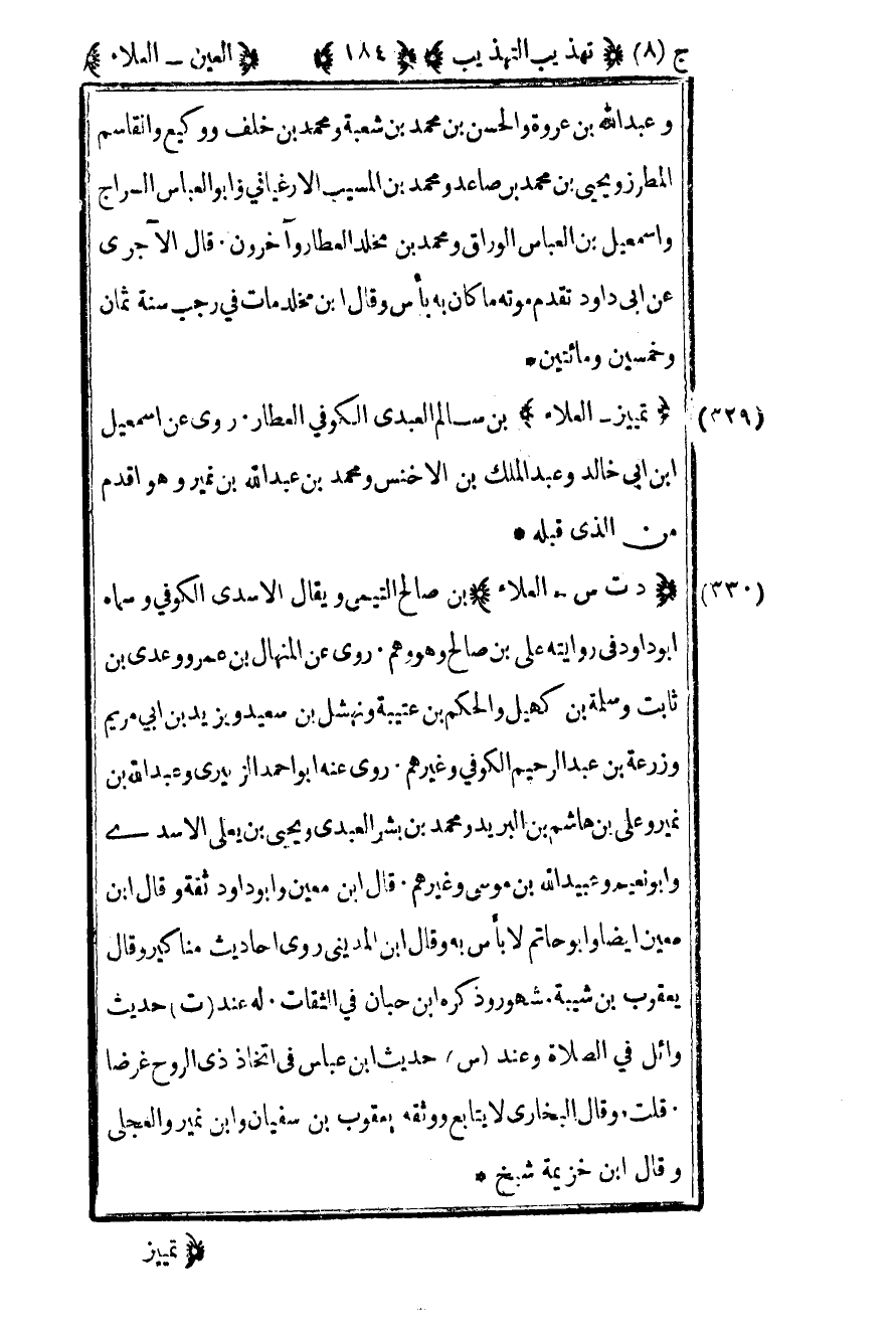 330- "تمييز – العلاء" بن سالم العبدي الكوفي العطار روى عن إسماعيل بن أبي خالد وعبد الملك بن الأخنس ومحمد بن عبد الله بن نمير وهو أقدم من الذي قبله