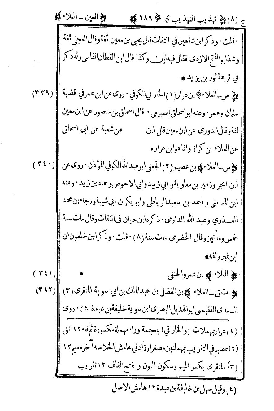 341- "س – العلاء" بن عصيم2 الجعفي أبو عبد الله الكوفي المؤذن روى عن بن أبجر وزهير بن معاوية وأبي زبيد وأبي الأحوص وحماد بن زيد وعنه بن المديني وأحمد بن سعيد الرباطي وأبو بكر بن أبي شيبه ورجاء بن محمد العذري وعبد الله الدارمي ذكره بن حبان في الثقات وقال مات سنة خمس ومائتين وقال الحضرمي مات سنة 8 قلت وذكر بن خلفون أن بن نمير وثقه