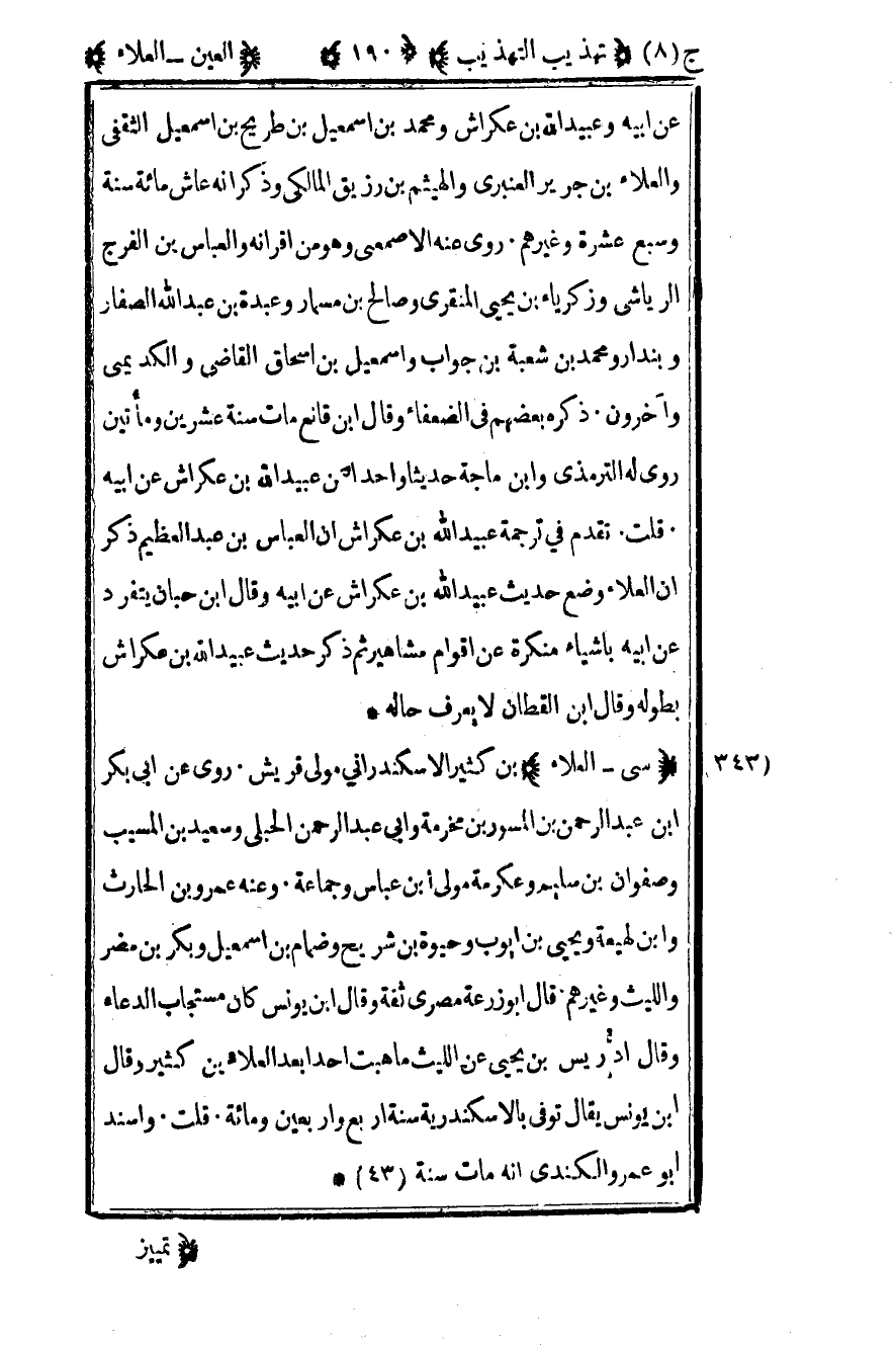 344- "سي – العلاء" بن كثير الإسكندراني مولى قريش روى عن أبي بكر بن عبد الرحمن بن المسور بن مخرمة وأبي عبد الرحمن الحبلي وسعيد بن المسيب وصفوان بن سليم وعكرمة مولى بن عباس وجماعه وعنه عمرو بن الحارث وابن لهيعة ويحيى بن أيوب وحيوة بن شريح وضمام بن إسماعيل وبكر بن مضر والليث وغيرهم قال أبو زرعة مصري ثقة وقال بن يونس كان مستجاب الدعاء وقال إدريس بن يحيى عن الليث ما هبت أحدا بعد العلاء بن كثير وقال بن يونس يقال توفي بالإسكندرية سنة أربع وأربعين ومائه قلت وأسند أبو عمرو الكندي أنه مات سنة"43"