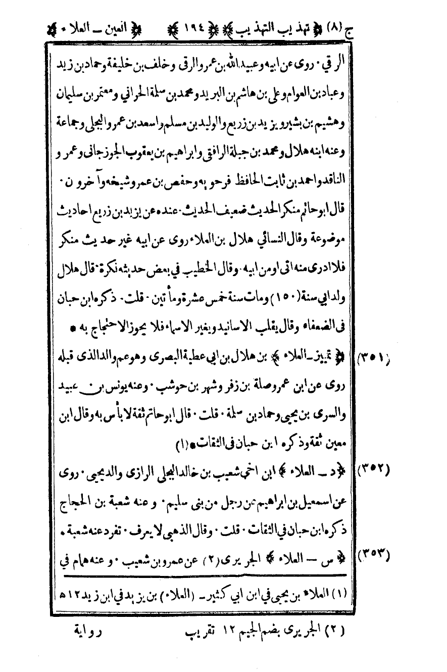 352 – "تمييز – العلاء" بن هلال بن أبي عطية البصري وهو عم والد الذي قبله روى عن بن عمرو صلة بن زفر وشهر بن حوشب وعنه يونس بن عبيد والسري بن يحيى وحماد بن سلمة قلت قال أبو حاتم ثقة لا بأس به وقال بن معين ثقة وذكره بن حبان في الثقات1