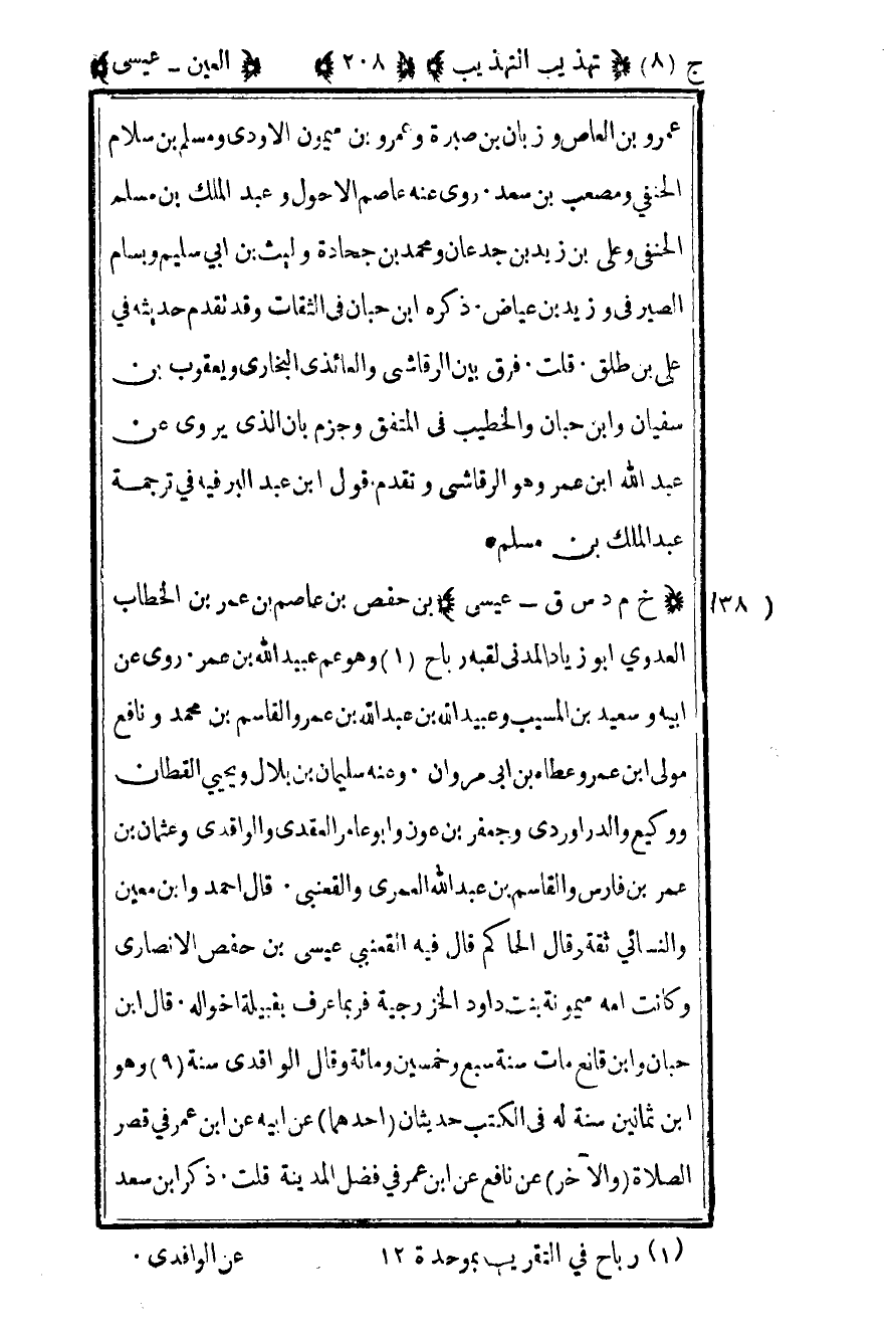 386- "خ م د س ق – عيسى" بن حفص بن عاصم بن عمر بن الخطاب العدوي أبو زياد المدني لقبه رباح1 وهو عم عبيد الله بن عمر روى عن أبيه وسعيد بن المسيب وعبيد الله بن عبد الله بن عمر والقاسم بن محمد ونافع مولى بن عمر وعطاء بن أبي مروان وعنه سليمان بن بلال ويحيى القطان ووكيع والداروردي وجعفر بن عون وأبو عامر العقدي والواقدي وعثمان بن عمر بن فارس والقاسم بن عبد الله العمري والقعنبي قال أحمد وابن معين والنسائي ثقة وقال الحاكم قال فيه القعنبي عيسى بن حفص الأنصاري وكانت أمه ميمونة بنت داود الخزرجية فربما عرف بقبيلة أخواله قال بن حبان وابن قانع مات سنة سبع وخمسين ومائة وقال الواقدي سنة 9 وهو بن ثمانين سنة له في الكتب حديثان أحدهما عن أبيه عن بن عمر في قصر الصلاة والآخر عن نافع عن بن عمر في فضل المدينة قلت ذكر بن سعد
