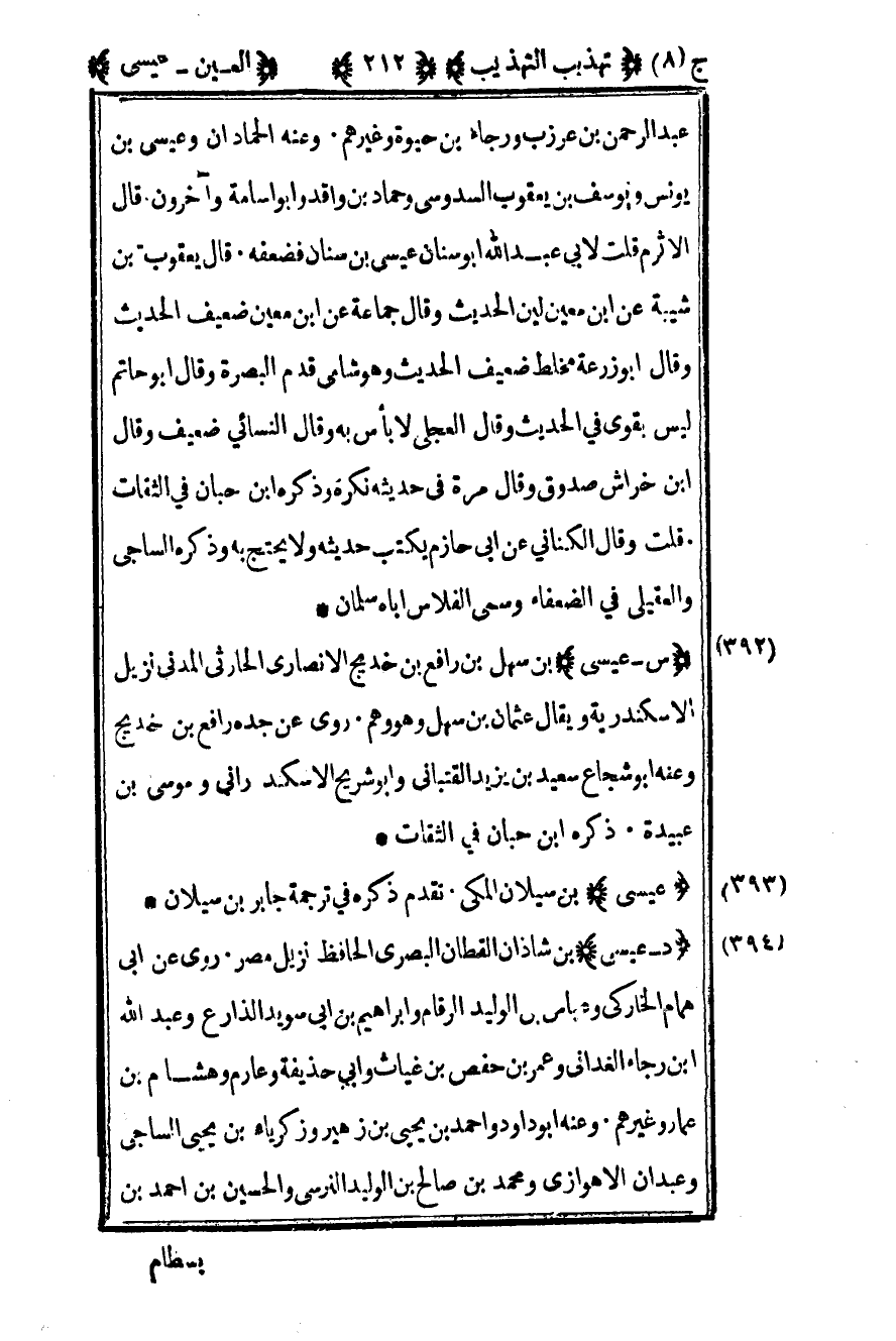 393 – "س – عيسى" بن سهل بن رافع بن خديج الأنصاري الحارثي المدني نزيل الإسكندرية ويقال عثمان بن سهل وهو وهم روى عن جده رافع بن خديج وعنه أبو شجاع سعيد بن يزيد القتباني وأبو شريح الإسكندراني وموسى بن عبيدة ذكره بن حبان في الثقات
