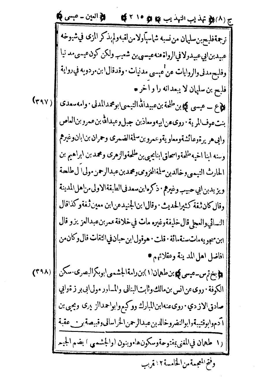 399 – "بخ تم س – عيسى" بن طهمان1 بن رامة الجشمي أبو بكر البصري سكن الكوفة روى عن أنس بن مالك وثابت البناني والمساور مولى أبي برزة وأبي صادق الأزدي روى عنه بن المبارك ووكيع وأبو أحمد الزبيري ويحيى بن آدم وأبو قتيبة وأبو النضر وخالد بن عبد الرحمن الخراساني وقبيصة بن عقبة