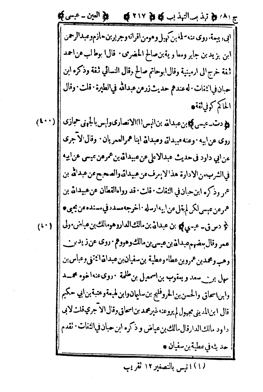 401- "د ت – عيسى" بن عبد الله بن أنيس1 الأنصاري وليس بالجهني حجازي روى عن أبيه وعنه عبيد الله وعبد الله ابنا عمر العمريان وقال الآجري عن أبي داود في حديث عبد الأعلى عن عبيد الله بن عمر عن عيسى عن أبيه في الشرب من الإداوة هذا لا يعرف عن عبيد الله والصحيح عن عبد الله بن عمر وذكره بن حبان في الثقات قلت قد رواه القطان عن عبيد الله بن عمر عن عيسى لكن لم يقل عن أبيه أرسله أخرجه مسدد في مسنده عن يحيى