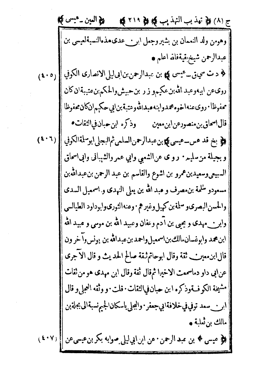 406 – "د ت سي ق – عيسى" بن عبد الرحمن بن أبي ليلى الأنصاري الكوفي روى عن أبيه وعبد الله بن عكيم وزر بن حبيش والحكم بن عتيبة إن كان محفوظا روى عنه أخوه محمد وابنه عبد الله وعتبة بن أبي حكيم إن كان محفوظا قال إسحاق بن منصور عن بن معين وذكره بن حبان في الثقات