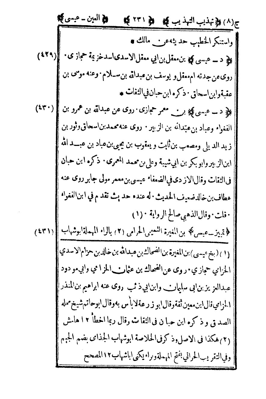 430- "د – عيسى" بن معقل بن أبي معقل الأسدي أسد خزيمة حجازي روى عن جدته أم معقل ويوسف بن عبد الله بن سلام وعنه موسى بن عقبة وابن إسحاق ذكره بن حبان في الثقات