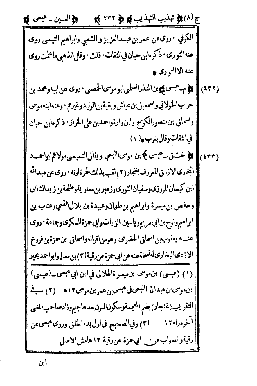 1 " عيسي بن موسي بن ميسرة الهلالي في ابن أبي عيسي –"عيسي" بن موسي بن عبد الله التيمي في عيسي بن عمر بن موسي 12