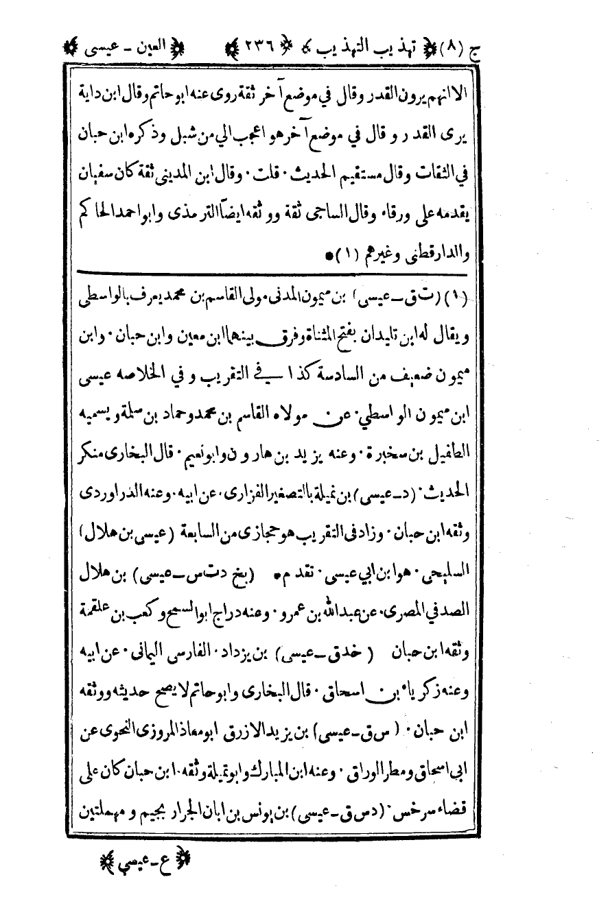 1 "ت ق عيسي" بن ميمون المدني مولي القاسم بن محمد يعرف بالواسطي ويقال له ابن تليدان بفتح المثناة وفرق بينهما ابن معين وابن حبان وابن ميمون ضعيف من السادسة كذا في التقريب وفي الخلاصة عيسي بن ميمون الواسطي عن مولاه القاسم بن محمد وحماد بن سلمة ويسميه الطفيل بن سخبرة وعنه يزيد بن هارون وأبو نعيم قال البخاري منكر الحديث " د – عيسي" بن نميلة بالتصغير الفزازي عن أبيه وعنه الذراوردي وثقة ابن حبان وزاد في التقريب هو حجازي من الساابعة "عيسي بن هلال" السليحي هو ابن ابي عيسي تقدم "بخ د ت س- عيسي" بن هلال الصدفي المصري عن عبد الله بن عمرو وعنه دراج أبوالسمح وكعب بن علقمةوثقة ابن حبان "خدق- عيسي" بن يزداد الفارسي اليماني عن أبيه وعنه زكريا بن اسحاق قال البخاري وأبو حاتم لا يصح حديثه ووثقه ابن حبان "س ق – عيسي" بن يزيد الأزرق ابو معاذ المروزي النحوي عن أبي اسحاق ومطر الوراق وعنه ابن المبارك وأبو تميلة وثقة ابن حبان كان علي قضاء سرخس "دس ق عيسي" بن يونس بن أبان الجرار بجيم ومهملتين أبو موسي الرملي الفاخوري عن بن مسلم وضمرة وعنه "س"ووثقه و"ق"قال ابن عساكر مات سنة أربع وستين ومائتين كذا قال صاحب الخلاصة ولكن زاد في التقريب لم يصح أن أبا داود روي له 12