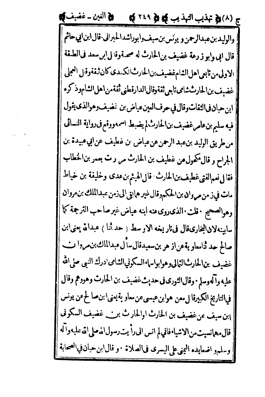 والوليد بن عبد الرحمن ويونس بن سيف وأبو راشد الحبراني قال بن أبي حاتم قال أبي وأبو زرعة غضيف بن الحارث له صحبة وقال بن سعد في الطبقة الأولى من تابعي أهل الشام غضيف بن الحارث الكندي كان ثقة وقال العجلي عضيف بن الحارث شامي تابعي ثقة وقال الدارقطني ثقة من أهل الشام وذكره بن حبان في الثقات وقال في حرف العين عياض بن غضيف وهو الذي يقول فيه سليم بن عامر غضيف بن الحارث لم يضبط اسمه ووقع في رواية النسائي من طريق الوليد بن عبد الرحمن عن عياض بن غطيف عن أبي عبيدة بن الجراح وقال مكحول عن غطيف بن الحارث مررت بعمر بن الخطاب فقال نعم الفتى غطيف بن الحارث قال الهيثم بن عدي وخليفة بن خياط مات في زمن مروان بن الحكم وقال غيرهما بقي إلى زمن عبد الملك بن مروان وهو الصحيح قلت الذي روى عنه ابنه عياض غير صاحب الترجمة كما سأبينه لأن البخاري قال في تاريخه الأوسط حدثنا عبد الله يعني بن صالح حدثنا معاوية عن أزهر بن سعيد قال سأل عبد الملك بن مروان غضيف بن الحارث الثمالي وهو أبو أسماء السكوني الشامي أدرك النبي صلى الله عليه وسلم وقال الثوري في حديث غضيف بن الحارث وهو وهم وقال في التاريخ الكبير قال معن هو بن عيسى عن معاوية يعني بن صالح عن يونس بن سيف عن غضيف بن الحارث أو الحارث بن غضيف السكوني قال مهما نسيت من الأشياء فإني لم أنس إني رأيت رسول الله صلى الله عليه وسلم واضعا يده اليمني على اليسرى في الصلاة وقال بن حبان في الصحابة
