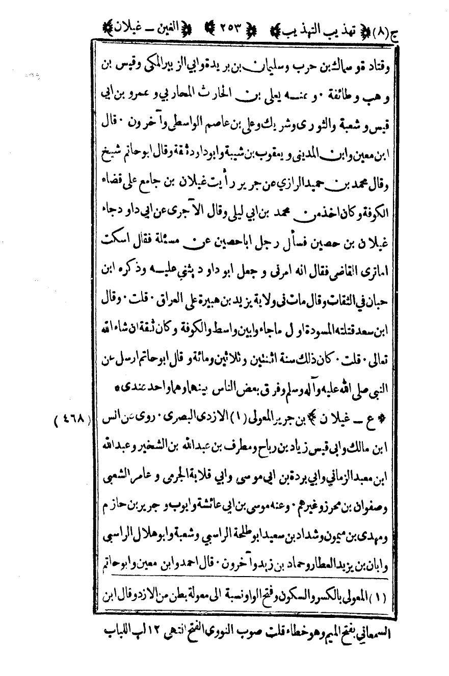 469– "ع – غيلان" بن جرير المعولي1 الأزدي البصري روى عن أنس بن مالك وأبي قيس زياد بن رباح ومطرف بن عبد الله بن الشخير وعبد الله بن معبد الزماني وأبي بردة بن أبي موسى وأبي قلابة الجرمي وعامر الشعبي وصفوان بن محرز وغيرهم وعنه موسى بن أبي عائشة وأيوب وجرير بن حازم ومهدي بن ميمون وشداد بن سعيد أبو طلحة الراسبي وشعبة وأبو هلال الراسبي وأبان بن يزيد العطار وحماد بن زيد وآخرون قال أحمد وابن معين وأبو حاتم