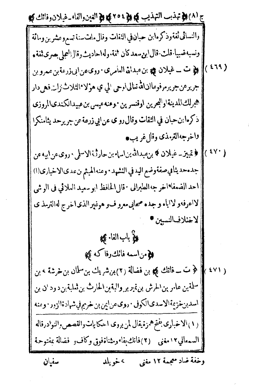 471- "تمييز غيلان بن عبد الله بن أسماء بن حارثة الأسلمي روى عن أبيه عن جده حديثا في صفة وضع اليد في التشهد وعنه الهيثم بن عدي الأخباري1 أحد الضعفاء أخرجه الطبراني قال الحافظ أبو سعيد العلائي في الوشي عرفة ولا أباه وجده صحابي معروف وهو غير الذي أخرج له الترمذي لاختلاف النسبين