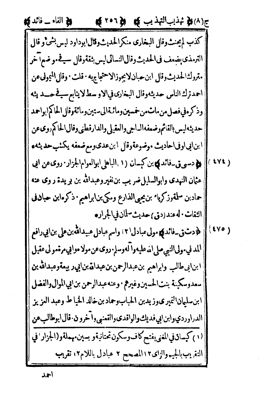 475– "د سي ق – فائد" بن كيسان1 الباهلي أبو العوام الجزار روى عن أبي عثمان النهدي وأبو السليل ضريب بن نفير وعبد الله بن بريدة روى عنه حماد بن سلمة وزكرياء بن يحيى الذارع ومكي بن إبراهيم ذكره بن حبان في الثقات له عند د ق حديث سليمان في الجرار