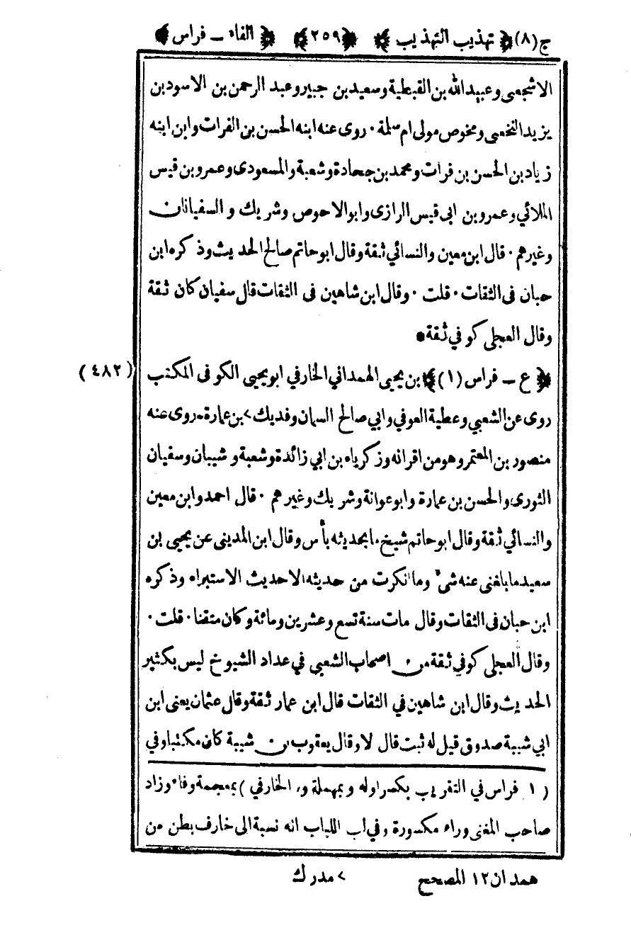 1 فراس في التقريب بكسر أوله وبمهملة والخارفي بمعحمة وفاء وزاد صاحب المغني وراء مكسورة وفي لب اللباب أنه نسبه إلي خارف بطن من همدان 12 المصحح