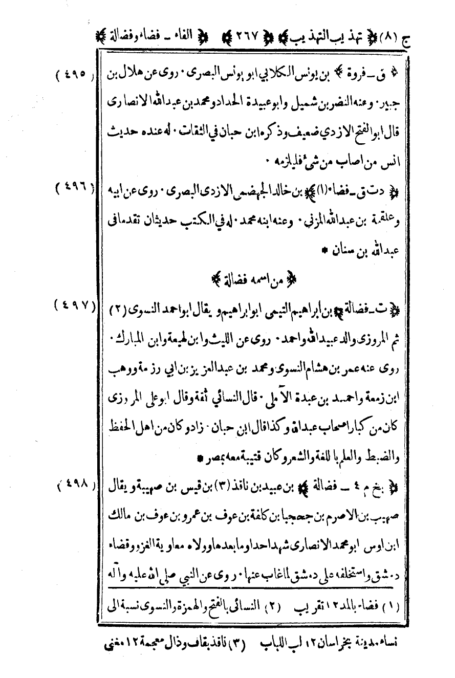 497- "د ت ق – فضاء1" بن خالد الجهضمي الأزدي البصري روى عن أبيه وعلقمة بن عبد الله المزني وعنه ابنه محمد له في الكتب حديثان تقدما في عبد الله بن سنان