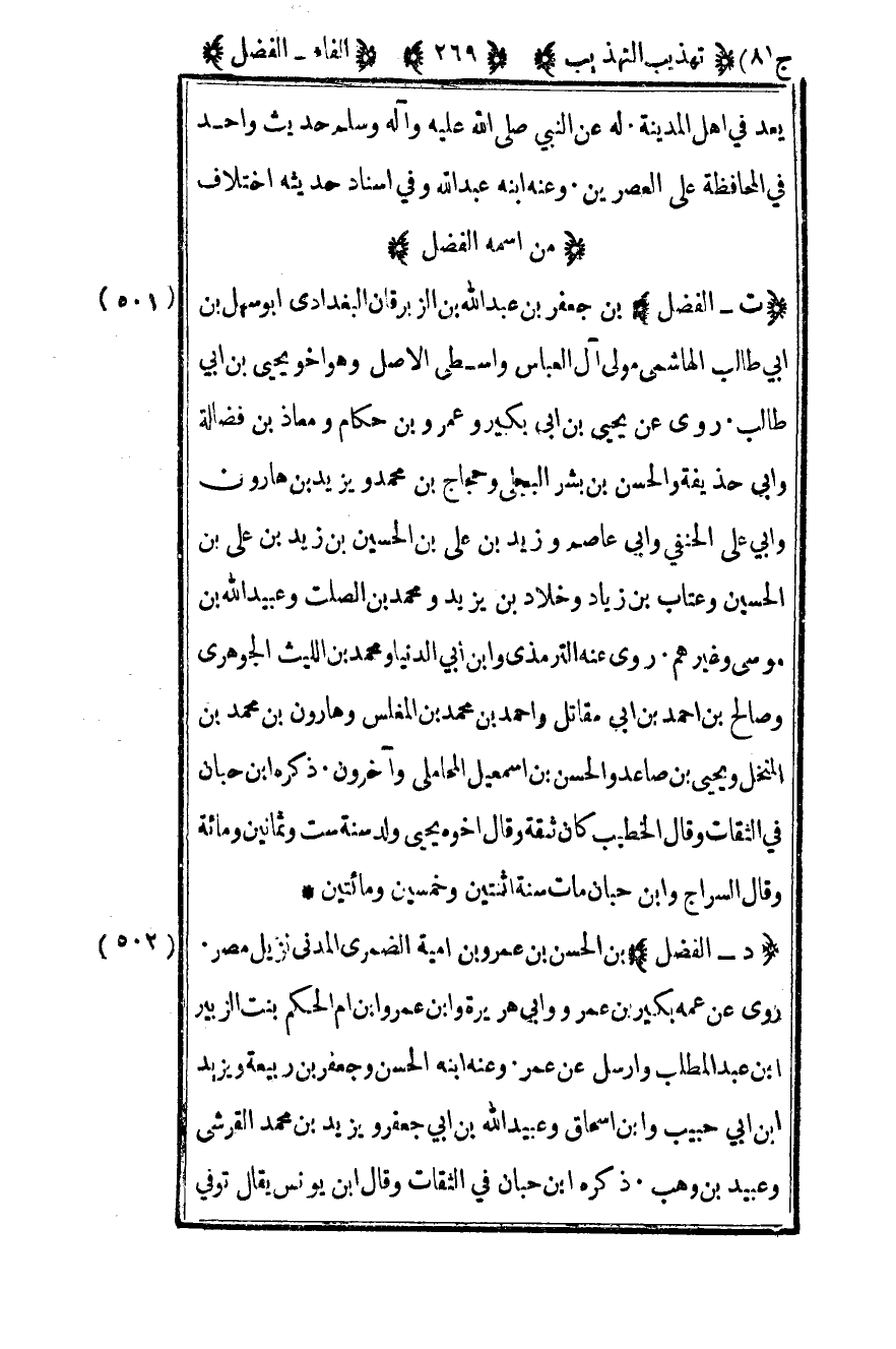 502- "ت – الفضل" بن جعفر بن عبد الله بن الزبرقان البغدادي أبو سهل بن أبي طالب الهاشمي مولى آل العباس واسطي الأصل وهو أخو يحيى بن أبي طالب روى عن يحيى بن أبي بكير وعمرو بن حكام ومعاذ بن فضالة وأبي حذيفة والحسن بن بشر البجلي وحجاج بن محمد ويزيد بن هارون وأبي علي الحنفي وأبي عاصم وزيدا بن علي بن الحسين بن زيد بن علي بن الحسين وعتاب بن زياد وخلاد بن يزيد ومحمد بن الصلت وعبيد الله بن موسى وغيرهم روى عنه الترمذي وابن أبي الدنيا ومحمد بن الليث الجوهري وصالح بن أحمد بن أبي مقاتل وأحمد بن محمد بن المغلس وهارون بن محمد بن المنخل ويحيى بن صاعد والحسن بن إسماعيل المحاملي وآخرون ذكره بن حبان في الثقات وقال الخطيب كان ثقة وقال أخوه يحيى ولد سنة ست وثمانين ومائة وقال السراج وابن حبان مات سنة اثنتين وخمسين ومائتين