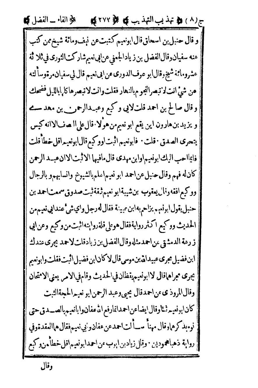وقال حنبل بن إسحاق قال أبو نعيم كتبت عن نيف ومائة شيخ ممن كتب عنه سفيان وقال الفضل بن زياد الجعفي عن أبي نعيم شاركت الثوري في ثلاثة عشر ومائة شيخ وقال أبو عوف الدوري عن أبي نعيم قال لي سفيان مرة وسألته عن شيء أنت لا تبصر النجوم بالنهار فقلت وأنت لا تبصرها كلها بالليل فضحك وقال صالح بن أحمد قلت لأبي وكيع وعبد الرحمن بن مهدي ويزيد بن هارون أين يقع أبو نعيم من هؤلاء قال على النصف إلا أنه كيس يتحرى الصدق قلت فأبو نعيم أثبت أو وكيع قال أبو نعيم أقل خطا قلت فأيما أحب إليك أبو نعيم أو بن مهدي قال ما فيهما الأثبت إلا أن عبد الرحمن كان له فهم وقال حنبل عن أحمد أبو نعيم أعلم بالشيوخ وانسابهم وبالرجال ووكيع أفقه وقال يعقوب بن شيبة أبو نعيم ثقة ثبت صدوق سمعت أحمد بن حنبل يقول أبو نعيم يزاحم به بن عيينة فقال له رجل وأي شيء عند أبي نعيم من الحديث ووكيع أكثر رواية فقال هو على قلة روايته أثبت من وكيع وعن أبي زرعة الدمشقي عن أحمد مثله وقال الفضل بن زياد قلت لأحمد يجري عندك بن فضيل مجرى عبيد الله بن موسى قال لا كان بن فضيل أثبت فقلت وأبو نعيم يجري مجراهما قال لا أبو نعيم يقظان في الحديث وقام في الأمر يعني في الامتحان وقال المروذي عن أحمد قال يحيى وعبد الرحمن أبو نعيم الحجة الثبت كان أبو نعيم ثبتا قال أيضا عن أحمد وإنما ورفع الله عفان وأبا نعيم بالصدق حتى نوه بذكرهما وقال مهنأ سألت أحمد عن عفان وأبي نعيم فقال هما العقدة وفي رواية ذهبا محمودين وقال زياد بن أيوب عن أحمد أبو نعيم أقل خطأ من وكيع