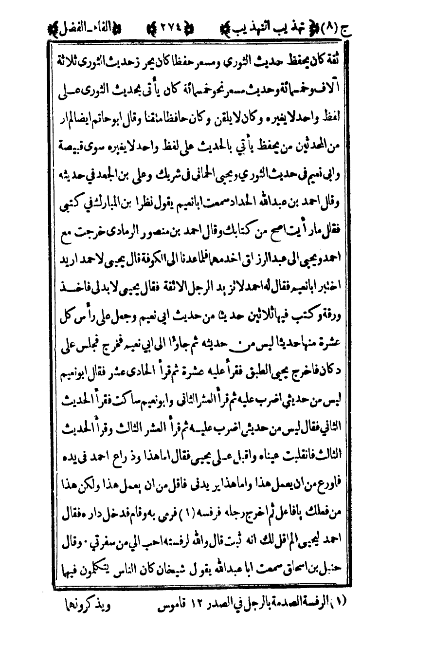 ثقة كان يحفظ حديث الثوري ومسعر حفظا كان يحرز حديث الثوري ثلاثة آلاف وخمسمائة وحديث مسعر نحو خمسمائة كان يأتي بحديث الثوري على لفظ واحد لا يغيره وكان لا يلقن وكان حافظا متقنا وقال أبو حاتم أيضا لم أر من المحدثين من يحفظ يأتي بالحديث على لفظ واحد لا يغيره سوى قبيصة وأبي نعيم في حديث الثوري ويحيى الحمادني في شريك وعلي بن الجعد في حديثه وقال أحمد بن عبد الله الحداد سمعت أبا نعيم يقول نظر بن المبارك في كتبي فقال ما رأيت أصح من كتابك وقال أحمد بن منصور الرمادي خرجت مع أحمد ويحيى إلى عبد الرزاق أخدمهما فلما عدنا إلى الكوفة قال يحيى لأحمد أريد أن اختبر أبا نعيم فقال له أحمد لا تزيد الرجل إلا ثقة فقال يحيى لا بد لي فأخذ ورقة وكتب فيها ثلاثين حديثا من حديث أبي نعيم وجعل على رأس كل عشرة منها حديثا ليس من حديثه ثم جاؤوا إلى أبي نعيم فخرج فجلس على دكان على دكان فأخرج يحيى الطبق فقرأ عليه عشرة ثم قرأ الحادي عشر فقال أبو نعيم ليس من حديثي اضرب عليه ثم قرأ العشر الثاني وأبو نعيم ساكت فقرأ الحديث الثاني فقال ليس من حديثي اضرب عليه ثم قرأ العشر الثالث وقرأ الحديث الثالث فانقلبت عيناه وأقبل على يحيى فقال أما هذا وذراع أحمد في يده فأورع من أن يعمل هذا وأما هذا يريدني فاقل من أن يعمل هذا ولكن هذا من فعلك يافاعل ثم أخرج رجله فرفسه1 فرمى به وقام فدخل داره فقال أحمد ليحيى ألم أقل لك أنه ثبت قال والله لرفسته أحب إلى من سفرتي وقال حنبل بن إسحاق سمعت أبا عبد الله يقول شيخان كان الناس يتكلمون فيهما