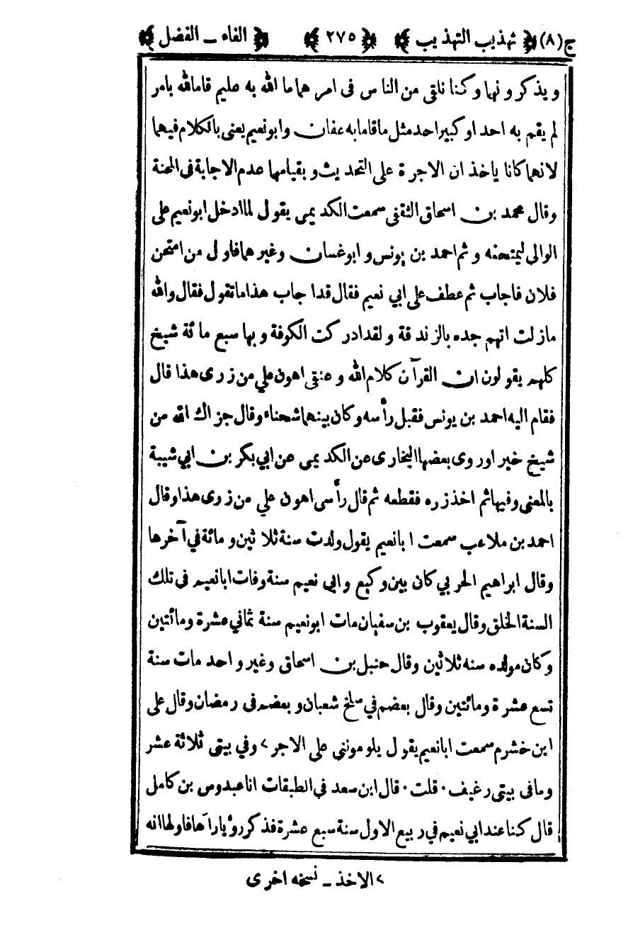 ويذكرونهما وكنا نلقى من الناس في أمرهما ما الله به عليم قاما لله بأمر لم يقم به أحد أو كبير أحد مثل ما قاما به عفان وأبو نعيم يعني بالكلام فيهما لأنهما كانا ياخذان الأجرة من التحديث وبقيامهما عدم الإجابة في المحنة وقال محمد بن إسحاق الثقفي سمعت الكديمي يقول لما أدخل أبو نعيم على الوالي ليمتحنه وثم أحمد بن يونس وأبو غسان وغيرهما فأول من امتحن فلان فأجاب ثم عطف على أبي نعيم فقال قد أجاب هذا ما تقول فقال والله ما زلت اتهم جده بالزندقة ولقد أدركت الكوفة وبها سبع مائة شيخ كلهم يقولون إن القرآن كلام الله وعنقي أهون على من زري هذا قال فقام إليه أحمد بن يونس فقبل رأسه وكان بينهما شحناء وقال جزاك الله من شيخ خيرا وروى بعضها البخاري عن الكديمي عن أبي بكر بن أبي شيبة بالمعنى وفيها ثم أخذ زره فقطعه ثم قال رأسي أهون على من زري هذا وقال أحمد بن ملاعب سمعت أبا نعيم يقول ولدت سنة ثلاثين ومائة في آخرها وقال إبراهيم الحربي كان بين وكيع وأبي نعيم سنة وفات أبا نعيم في تلك السنة الخلق وقال يعقوب بن سفيان مات أبو نعيم سنة ثماني عشرة ومائتين وكان مولده سنة ثلاثين وقال حنبل بن إسحاق وغير واحد مات سنة تسع عشرة ومائتين وقال بعضهم في سلخ شعبان وبعضهم في رمضان وقال علي بن خشرم سمعت أبا نعيم يقول يلومونني على الأجر1 وفي بيتي ثلاثة عشر وما في بيتي رغيف قلت قال بن سعد في الطبقات أنا عبدوس بن كامل قال كنا عند أبي نعيم في ربيع الأول سنة سبع عشرة فذكر رؤيا رآها فأولها أنه