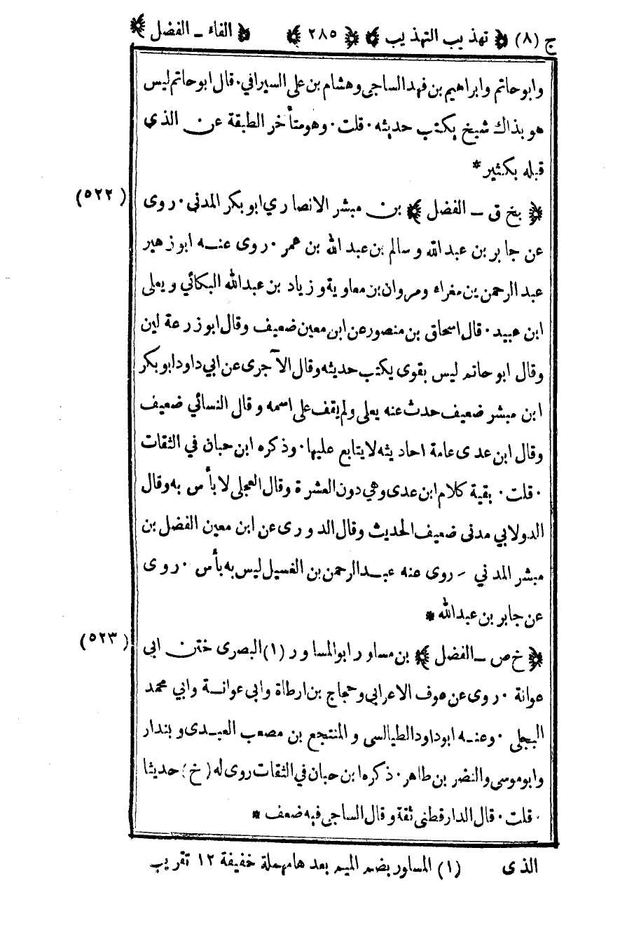 524- "بخ ق – الفضل" بن مبشر الأنصاري أبو بكر المدني روى عن جابر بن عبد الله وسالم بن عبد الله بن عمر روى عنه أبو زهير عبد الرحمن بن مغراء ومروان بن معاوية وزياد بن عبد الله البكائي ويعلى بن عبيد قال إسحاق بن منصور عن بن معين ضعيف وقال أبو زرعة لين وقال أبو حاتم ليس بقوي يكتب حديثه وقال الآجري عن أبي داود أبو بكر بن مبشر ضعيف حدث عنه يعلى ولم يقف على اسمه وقال النسائي ضعيف وقال بن عدي عامة أحاديثه لا يتابع عليها وذكره بن حبان في الثقات قلت بقية كلام بن عدي وهي دون العشرة وقال العجلي لا بأس به وقال الدولابي مدني ضعيف الحديث وقال الدوري عن بن معين الفضل بن مبشر المدني روى عنه عبد الرحمن بن الغسيل ليس به بأس روى عن جابر بن عبد الله