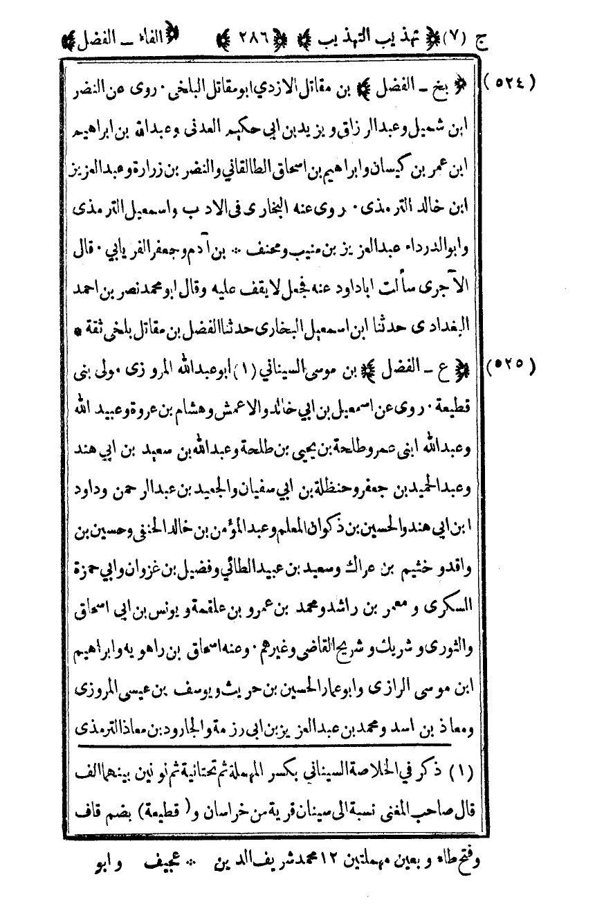 527- "ع – الفضل" بن موسى السيناني2 أبو عبد الله المروزي مولى بني قطيعة روى عن إسماعيل بن أبي خالد والأعمش وهشام بن عروة وعبيد الله وعبد الله ابني عمر وطلحة بن يحيى بن طلحة وعبد الله بن سعيد بن أبي هند وعبد الحميد بن جعفر وحنظلة بن أبي سفيان والجعيد بن عبد الرحمن وداود بن أبي هند والحسين بن ذكوان المعلم وعبد المؤمن بن خالد الحنفي وحسين بن واقد وخثيم بن عراك وسعيد بن عبيد الطائي وفضيل بن غزوان وأبي حمزة السكري ومعمر بن راشد ومحمد بن عمرو بن علقمة ويونس بن أبي إسحاق والثوري وشريك القاضي وغيرهم وعنه إسحاق بن راهويه وإبراهيم بن موسى الرازي وأبو عمار الحسين بن حريث ويوسف بن عيسى المروزي ومعاذ بن أسد ومحمد بن عبد العزيز بن أبي رزمة والجارود بن معاذ الترمذي