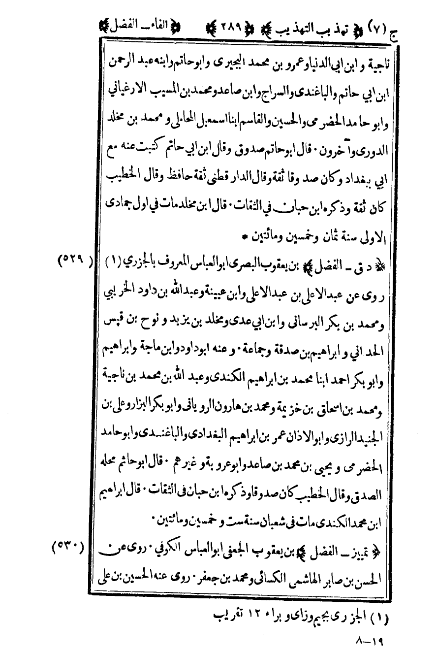 531– "د ق – الفضل" بن يعقوب البصري أبو العباس المعروف بالجزري1 روى عن عبد الأعلى بن عبد الأعلى وابن عيينة وعبد الله بن داود الخريبي ومحمد بن بكر البرساني وابن أبي عدي ومخلد بن يزيد ونوح بن قيس الحداني وإبراهيم بن صدقة وجماعة وعنه أبو داود وابن ماجة وإبراهيم وأبو بكر أحمد ابنا محمد بن إبراهيم الكندي وعبد الله بن محمد بن ناجية ومحمد بن إسحاق بن خزيمة ومحمد بن هارون الروياني وأبو بكر البزار وعلي بن الجنيد الرازي وأبو الأذان عمر بن إبراهيم البغدادي والباغندي وأبو حامد الحضرمي ويحيى بن محمد بن صاعد وأبو عروبة وغيرهم وقال أبو حاتم محله الصدق وقال الخطيب كان صدوقا وذكره بن حبان في الثقات قال إبراهيم بن محمد الكندي مات في شعبان سنة ست وخمسين ومائتين