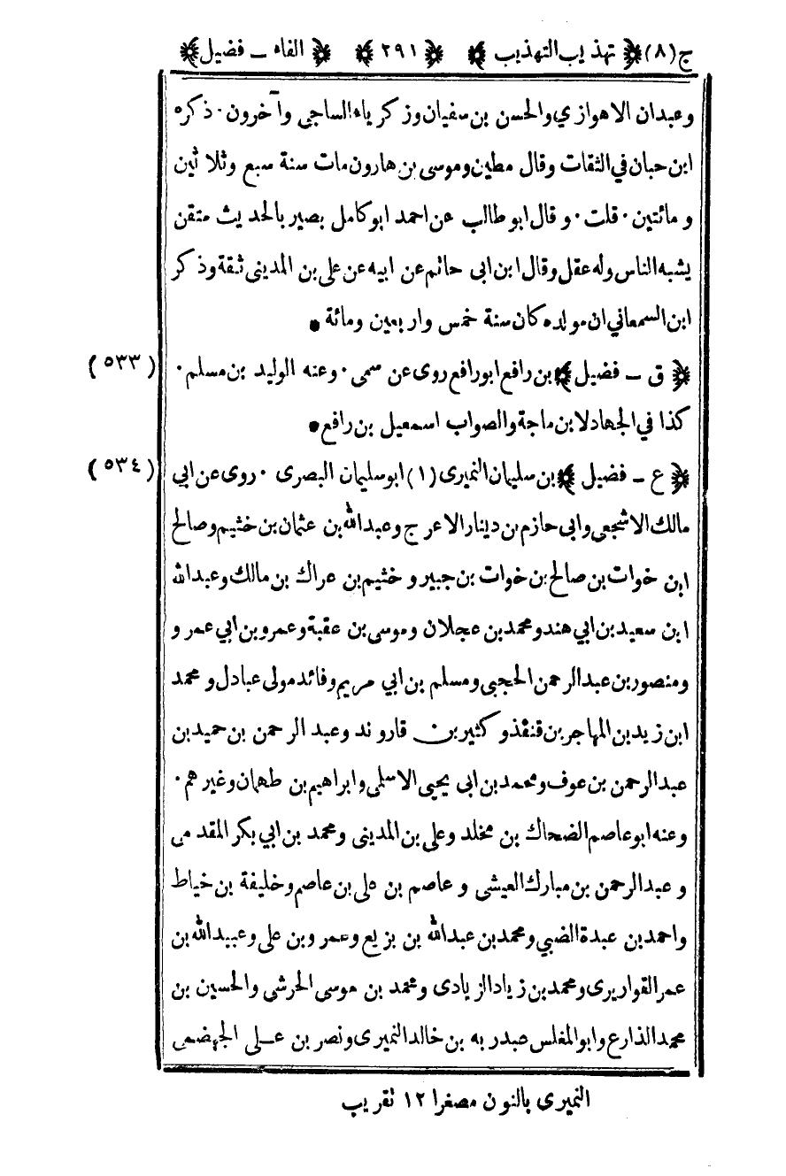 536– "ع – فضيل" بن سليمان النميري1 أبو سليمان البصري روى عن أبي مالك الأشجعي وأبي حازم بن دينار الأعرج وعبد الله بن عثمان بن خثيم وصالح بن خوات بن صالح بن خوات بن جبير وخثيم بن عراك بن مالك وعبد الله بن سعيد بن أبي هند ومحمد بن عجلان وموسى بن عقبة وعمرو ومنصور بن عبد الرحمن الحجبي ومسلم بن أبي مريم وفائد مولى عبادل ومحمد بن زيد بن المهاجر بن قنفذ وكثير بن قاروند وعبد الرحمن بن حميد بن عبد الرحمن بن عوف ومحمد بن أبي يحيى الأسلمي وإبراهيم بن طهمان وغيرهم وعنه أبو عاصم الضحاك بن مخلد وعلي بن المديني ومحمد بن أبي بكر المقدمي وعبد الرحمن بن مبارك العيشي وعاصم بن علي بن عاصم وخليفة بن خياط وأحمد بن عبدة الضبي ومحمد بن عبد الله بن بزيع وعمرو بن علي وعبيد الله بن عمر القواريري ومحمد بن زياد الزيادي ومحمد بن موسى الحرشي والحسين بن محمد الذراع وأبو المغلس عبد ربه بن خالد النميري ونصر بن علي الجهضمي