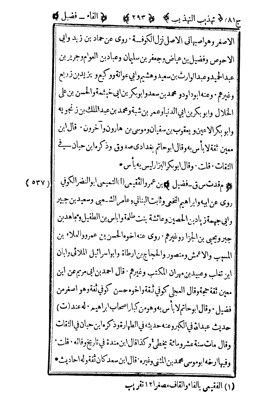 539– "م قد س ق – فضيل" بن عمرو الفقيمي1 التميمي أبو النضر الكوفي روى عن أبيه وإبراهيم النخعي وثابت البناني وعامر الشعبي وسعيد بن جبير وأبي جهمة زياد بن الحصين وعائشة بنت طلحة وإياس بن الطفيل ومجاهد بن جبر ويحيى بن الجزار وغيرهم روى عنه أخوه الحسن بن عمرو والعلاء بن المسيب والأعمش ومنصور والحجاج بن أرطاة وأبو إسرائيل الملائي وأبان بن تغلب وعبيد بن مهران المكتب وغيرهم قال أحمد بن أبي مريم عن بن معين ثقة حجة وقال العجلي كوفي ثقة وأخوه حسن كوفي ثقة وهو أصغر من فضيل وقال أبو حاتم لا بأس به وهو من كبار أصحاب إبراهيم له عند ت حديث عبد الله في الكبر وعنه حديثه في الطهارة وذكره بن حبان في الثقات وقال مات سنة عشر ومائة يخطىء وكذا قال بن مندة في تاريخ وفاته قلت وفيها أرخه أبو موسى محمد بن المثنى وغيره قال بن سعد كان ثقة وله أحاديث