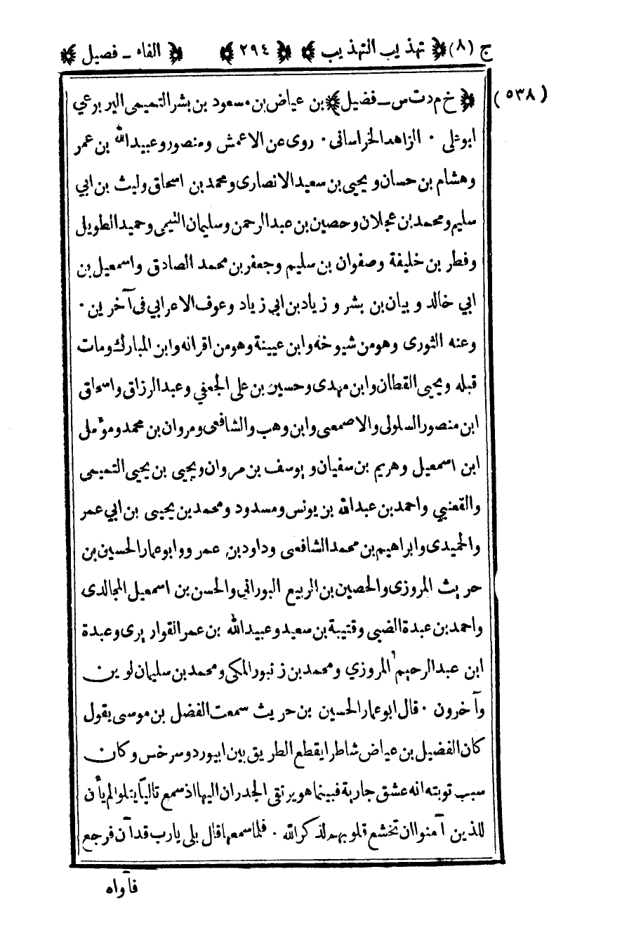540- "خ م د ت س – فضيل" بن عياض بن مسعود بن بشر التميمي اليربوعي أبو علي الزاهد الخراساني روى عن الأعمش ومنصور وعبيد الله بن عمر وهشام بن حسان ويحيى بن سعيد الأنصاري ومحمد بن إسحاق وليث بن أبي سليم ومحمد بن عجلان وحصين بن عبد الرحمن وسليمان التيمي وحميد الطويل وفطر بن خليفة وصفوان بن سليم وجعفر بن محمد الصادق وإسماعيل بن أبي خالد وبيان بن بشر وزياد بن أبي زياد وعوف الأعرابي في آخرين وعنه الثوري وهو من شيوخه وابن عيينة وهو من أقرانه وابن المبارك ومات قبله ويحيى القطان وابن مهدي وحسين بن علي الجعفي وعبد الرزاق وإسحاق بن منصور السلولي والأصمعي وابن وهب والشافعي ومروان بن محمد ومؤمل بن إسماعيل وهريم بن سفيان ويوسف بن مروان ويحيى بن يحيى التميمي والقعنبي وأحمد بن عبد الله بن يونس ومسدود ومحمد بن يحيى بن أبي عمر والحميدي وإبراهيم بن محمد الشافعي وداود بن عمرو وأبو عمار الحسين بن حريث المروزي والحصين بن الربيع البوراني والحسن بن إسماعيل المجالدي وأحمد بن عبدة الضبي وقتيبة بن سعيد وعبيد الله بن عمر القواريري وعبدة بن عبد الرحيم المروزي ومحمد بن زنبور المكي ومحمد بن سليمان لوين وآخرون قال أبو عمار الحسين بن حريث سمعت الفضل بن موسى يقول كان الفضيل بن عياض شاطرا يقطع الطريق بين ابيورد وسرخس وكان سبب توبته أنه عشق جارية فبينما هو يرتقي الجدران إليها إذ سمع تاليا يتلو {أَلَمْ يَأْنِ لِلَّذِينَ آمَنُوا أَنْ تَخْشَعَ قُلُوبُهُمْ لِذِكْرِ اللَّهِ} فلما سمعها قال بلى يا رب قد آن فرجع