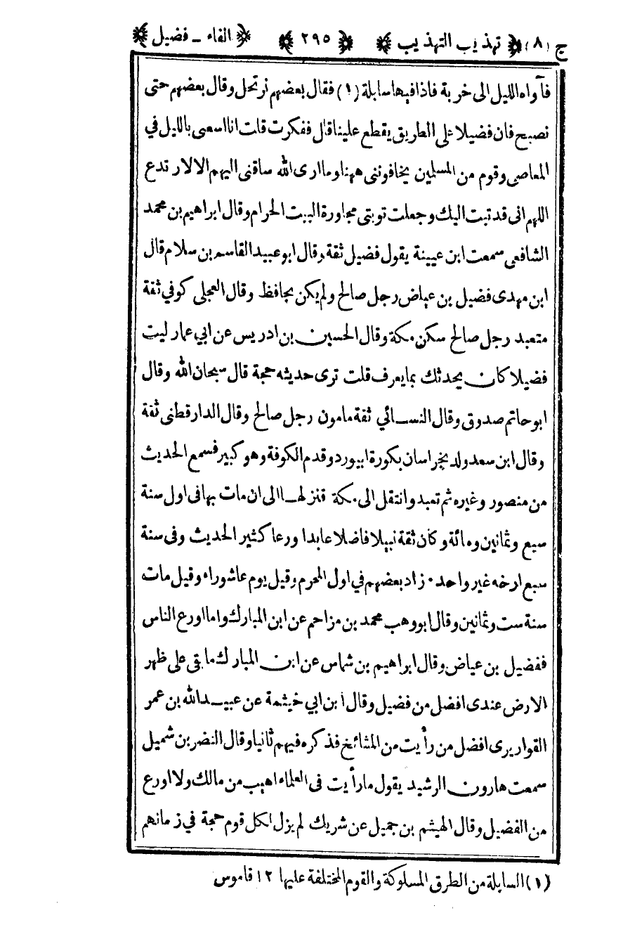 فآواه الليل إلى خربة فإذا فيها سابلة1 فقال بعضهم نرتحل وقال بعضهم حتى نصبح فإن فضيلا على الطريق يقطع علينا قال ففكرت قلت أنا أسعى بالليل في المعاصي وقوم من المسلمين يخافونني ها هنا وما أرى الله ساقني إليهم إلا لارتدع اللهم إني قد تبت إليك وجعلت توبتي مجاورة البيت الحرام وقال إبراهيم بن محمد الشافعي سمعت بن عيينة يقول فضيل ثقة وقال أبو عبيد القاسم بن سلام قال بن مهدي فضيل بن عياض رجل صالح ولم يكن بحافظ وقال العجلي كوفي ثقة متعبد رجل صالح سكن مكة وقال الحسين بن إدريس عن أبي عمار ليت فضيلا كان يحدثك بما يعرف قلت ترى حديثه حجة قال سبحان الله وقال أبو حاتم صدوق وقال النسائي ثقة مأمون رجل صالح وقال الدارقطني ثقة وقال بن سعد ولد بخراسان بكورة ابيورد وقدم الكوفة وهو كبير فسمع الحديث من منصور وغيرهم ثم تعبد وانتقل إلى مكة فنزلها إلى أن مات بها في أول سنة سبع وثمانين ومائة وكان ثقة نبيلا فاضلا عابدا ورعا كثير الحديث وفي سنة سبع أرخه غير واحد زاد بعضهم في أول المحرم وقيل يوم عاشوراء وقيل مات سنة ست وثمانين وقال أبو وهب محمد بن مزاحم عن بن المبارك وأما أورع الناس ففصيل بن عياض وقال إبراهيم بن شماس عن بن المبارك ما بقي على ظهر الأرض عندي أفضل من فضيل وقال بن أبي خيثمة عن عبيد الله بن عمر القواريري أفضل من رأيت من المشائخ فذكره فيهم ثانيا وقال النضر بن شميل سمعت هارون الرشيد يقول ما رأيت في العلماء أهيب من مالك ولا أورع من الفضيل وقال الهيثم بن جميل عن شريك لم يزل لكل قوم حجة في زمانهم