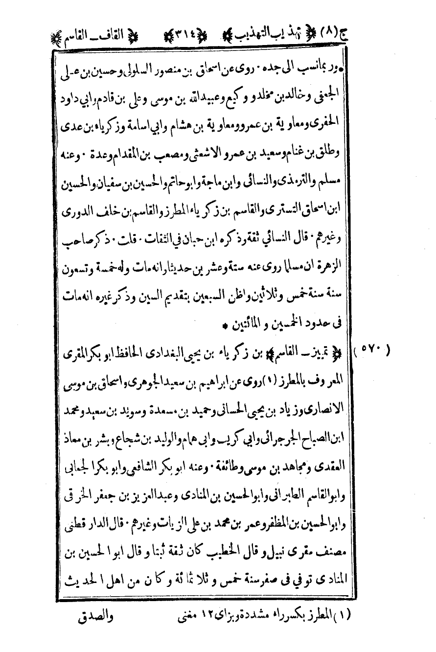 572- "تمييز – القاسم" بن زكريا بن يحيى البغدادي الحافظ أبو بكر المقري المعروف بالمطرز1 روى عن إبراهيم بن سعيد الجوهري وإسحاق بن موسى الأنصاري وزياد بن يحيى الحساني وحميد بن مسعدة وسويد بن سعيد ومحمد بن الصباح الجرجرائي وأبي كريب وأبي همام والوليد بن شجاع وبشر بن معاذ العقدي ومجاهد بن موسى وطائفة وعنه أبو بكر الشافعي وأبو بكر الجعابي وأبو القاسم الطبراني وأبو الحسين بن المنادي وعبد العزيز بن جعفر الخرقي وأبو الحسين بن المظفر وعمر بن محمد بن علي الزيات وغيرهم قال الدارقطني مصنف مقرئ نبيل وقال الخطيب كان ثقة ثبتا وقال أبو الحسين بن المنادي توفي في صفر سنة خمس وثلاثمائة وكان من أهل الحديث