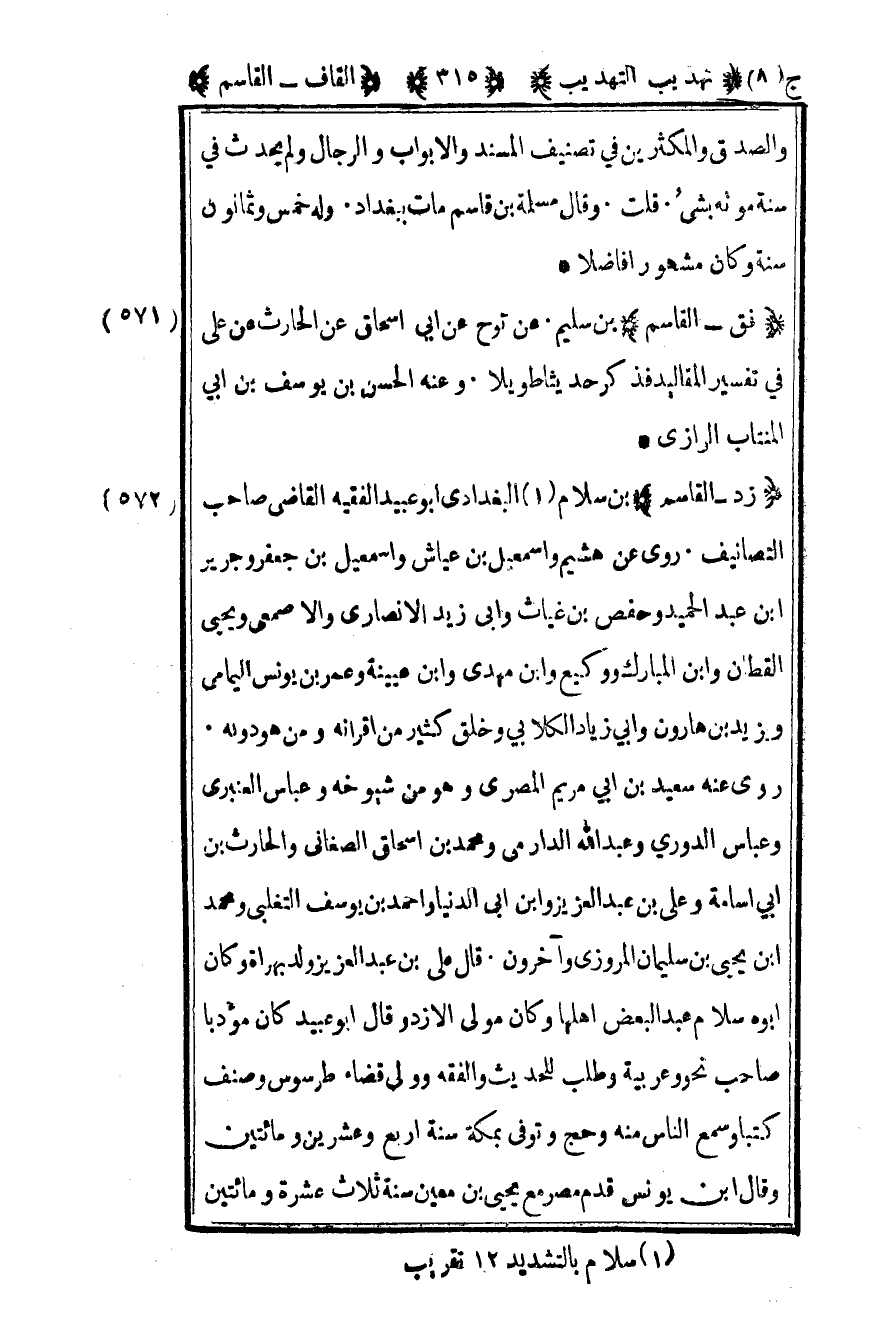 574- "ز د – القاسم" بن سلام1 البغدادي أبو عبيد الفقيه القاضي صاحب التصانيف روى عن هشيم وإسماعيل بن عياش وإسماعيل بن جعفر وجرير بن عبد الحميد وحفص بن غياث وأبي زيد الأنصاري والأصمعي ويحيى القطان وابن المبارك ووكيع وابن مهدي وابن عيينة وعمر بن يونس اليمامي ويزيد بن هارون وأبي زياد الكلابي وخلق كثير من أقرانه ومن هو دونه روى عنه سعيد بن أبي مريم المصري وهو من شيوخه وعباس العنبري وعباس الدوري وعبد الله الدارمي ومحمد بن إسحاق الصغاني والحارث بن أبي أسامة وعلي بن عبد العزيز وابن أبي الدنيا وأحمد بن يوسف التغلبي ومحمد بن يحيى بن سليمان المروزي وآخرون قال علي بن عبد العزيز ولد بهراة وكان أبوه سلام عبد البعض أهلها وكان مولى الأزد وقال أبو عبيد كان مؤدبا صاحب نحو وعربية وطلب للحديث والفقه وولي قضاء