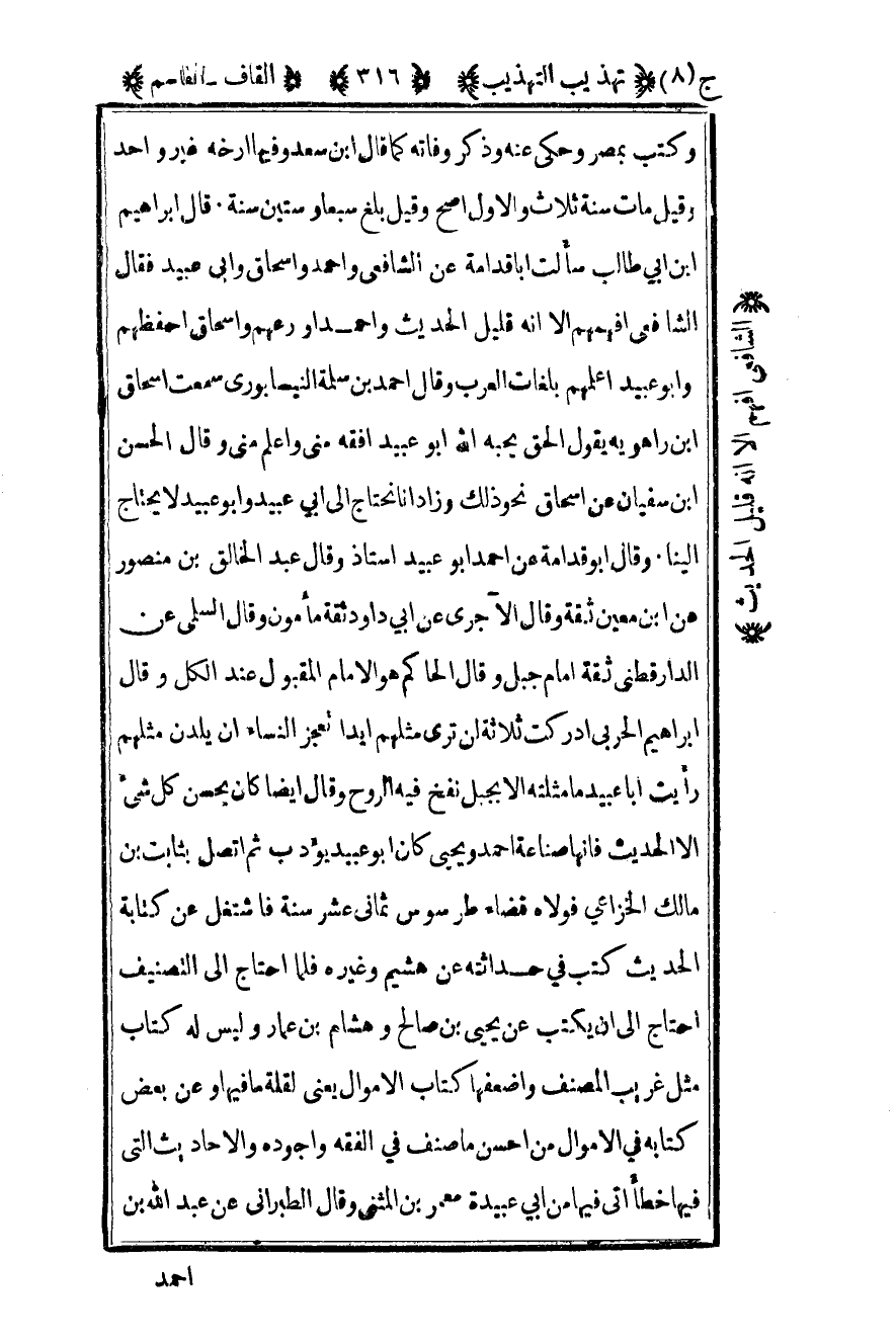 وكتب بمصر وحكى عنه وذكر وفاته كما قال بن سعد وفيها أرخه غير واحد وقيل مات سنة ثلاث والأول أصح وقيل بلغ سبعا وستين سنة قال إبراهيم بن أبي طالب سألت أبا قدامة عن الشافعي وأحمد وإسحاق وأبي عبيد فقال الشافعي أفهمهم إلا أنه قليل الحديث وأحمد أورعهم وإسحاق أحفظهم وأبو عبيد أعلمهم بلغات العرب وقال أحمد بن سلمة النيسابوري سمعت إسحاق بن راهويه يقول الحق يحبه الله أبو عبيد أفقه مني وأعلم مني وقال الحسن بن سفيان عن إسحاق نحو ذلك وزاد أنا نحتاج إلى أبي عبيد وأبو عبيد لا يحتاج إلينا وقال أبو قدامة عن أحمد أبو عبيد أستاذ وقال عبد الخالق بن منصور عن بن معين ثقة وقال الآجري عن أبي داود ثقة مأمون وقال السلمي عن الدارقطني ثقة إمام جبل وقال الحاكم هو الإمام المقبول عند الكل وقال إبراهيم الحربي أدركت ثلاثة لن ترى مثلهم أبدا تعجز النساء أن يلدن مثلهم رأيت أبا عبيد ما مثلته الا بجبل نفخ فيه الروح وقال أيضا كان يحسن كل شيء إلا الحديث فإنها صناعة أحمد ويحيى كان أبو عبيد يؤدب ثم اتصل بثابت بن مالك الخزاعي فولاه قضاء طرسوس ثماني عشر سنة فاشتغل عن كتابة الحديث كتب في حداثته عن هشيم وغيره فلما أحتاج إلى التصنيف أحتاج إلى أن يكتب عن يحيى بن صالح وهشام بن عمار وليس له كتاب مثل غريب المصنف وأضعفها كتاب الأموال يعني لقلة ما فيها وعن بعض كتابة في الأموال من أحسن ما صنف في الفقه وأجوده والأحاديث التي فيها خطأ أتى فيها من أبي عبيدة معمر بن المثنى وقال الطبراني عن عبد الله بن
