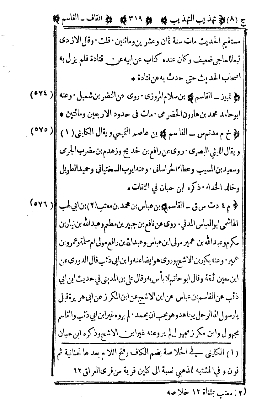 576- " تمييز – القاسم" بن سلام المروزي روى عن النضر بن شميل وعنه أبو حامد محمد بن هارون الحضرمي مات في حدود الأربعين ومائتين