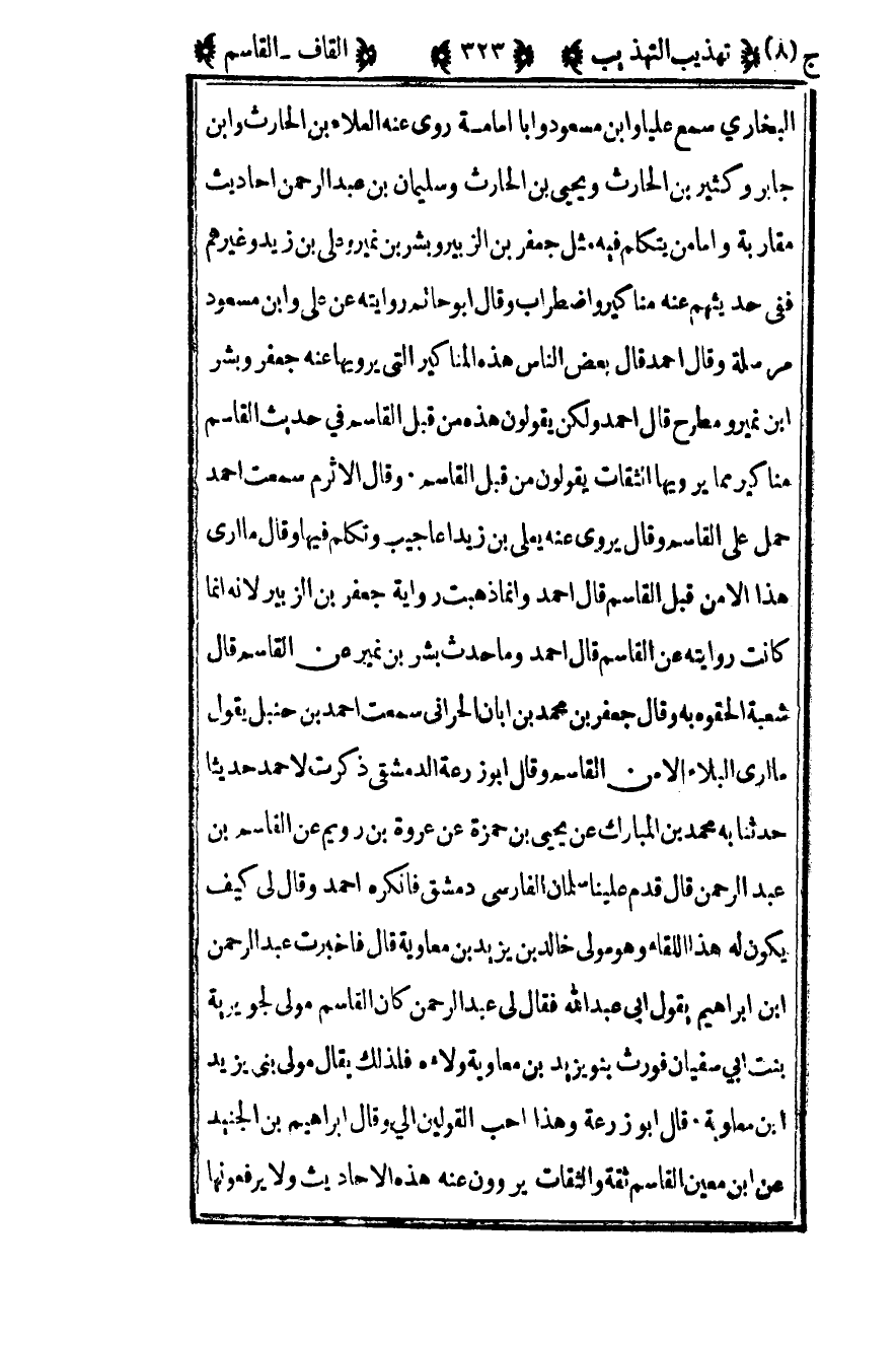 البخاري سمع عليا وابن مسعود وأبا أمامة روى عنه العلاء بن الحارث وابن جابر وكثير بن الحارث ويحيى بن الحارث وسليمان بن عبد الرحمن أحاديث مقاربة وأما من يتكلم فيه مثل جعفر بن الزبير وبشر بن نمير وعلي بن زيد وغيرهم ففي حديثهم عنه مناكير واضطراب وقال أبو حاتم روايته عن علي وابن مسعود مرسلة وقال أحمد قال بعض الناس هذه المناكير التي يرويها عنه جعفر وبشر بن نمير ومطرح قال أحمد ولكن يقولون هذه من قبل القاسم في حديث القاسم مناكير مما يرويها الثقات يقولون من قبل القاسم وقال الأثرم سمعت أحمد حمل على القاسم وقال يروي عنه يعلى بن زيد أعاجيب وتكلم فيها وقال ما أرى هذا إلا من قبل القاسم قال أحمد وإنما ذهبت رواية جعفر بن الزبير لأنه إنما كانت روايته عن القاسم قال أحمد وما حدث بشر بن نمير عن القاسم قال شعبة ألحقوه به وقال جعفر بن محمد بن أبان الحراني سمعت أحمد بن حنبل يقول ما أرى البلاء إلا من القاسم وقال أبو زرعة الدمشقي ذكرت لأحمد حديثا حدثنا به محمد بن المبارك عن يحيى بن حمزة عن عروة بن رويم عن القاسم بن عبد الرحمن قال قدم علينا سلمان الفارسي دمشق فأنكره أحمد وقال لي كيف يكون له هذا اللقاء وهو مولى خالد بن يزيد بن معاوية قال فأخبرت عبد الرحمن بن إبراهيم يقول أبي عبد الله فقال لي عبد الرحمن كان القاسم مولى لجويرية بنت أبي سفيان فورث بنو يزيد بن معاوية ولاءه فلذلك يقال مولى بني يزيد بن معاوية قال أبو زرعة وهذا أحب القولين إلي وقال إبراهيم بن الجنيد عن بن معين القاسم ثقة والثقات يروون عنه هذه الأحاديث ولا يرفعونها