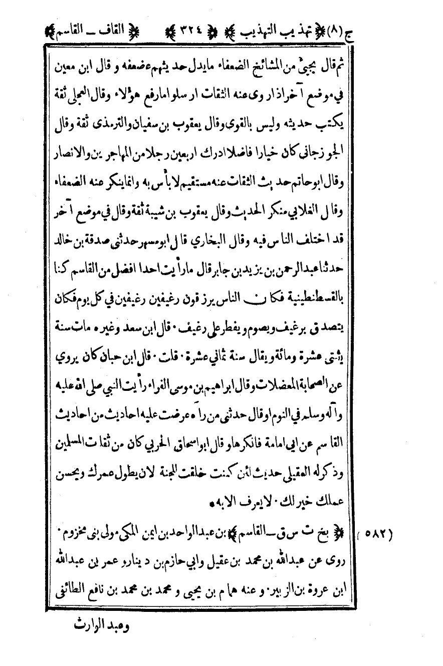 ثم قال يجيء من المشائخ الضعفاء ما يدل حديثهم على ضعفه وقال بن معين في موضع آخر إذا روى عنه الثقات أرسلوا ما رفع هؤلاء وقال العجلي ثقة يكتب حديثه وليس بالقوي وقال يعقوب بن سفيان والترمذي ثقة وقال الجوزجاني كان خيارا فاضلا أدرك أربعين رجلا من المهاجرين والأنصار وقال أبو حاتم حديث الثقات عنه مستقيم لا بأس به وإنما ينكر عنه الضعفاء وقال الغلابي منكر الحديث وقال يعقوب بن شيبة ثقة وقال في موضع آخر قد اختلف الناس فيه وقال البخاري قال أبو مسهر حدثني صدقة بن خالد حدثنا عبد الرحمن بن يزيد بن جابر قال ما رأيت أحدا أفضل من القاسم كنا بالقسطنطينية فكان الناس يرزقون رغيفين رغيفين في كل يوم فكان يتصدق برغيف ويصوم ويفطر على رغيف قال بن سعد وغيره مات سنة اثنتي عشرة ومائة ويقال سنة ثماني عشرة قلت قال بن حبان كان يروي عن الصحابة المعضلات وقال إبراهيم بن موسى الفراء رأيت النبي صلى الله عليه وسلم في النوم أو قال حدثني من رآه عرضت عليه أحاديث من أحاديث القاسم عن أبي أمامة فأنكرها وقال أبو إسحاق الحربي كان من ثقات المسلمين وذكر له العقيلي حديث لئن كنت خلقت للجنة لأن يطول عمرك ويحسن عملك خير لك لا يعرف إلا به